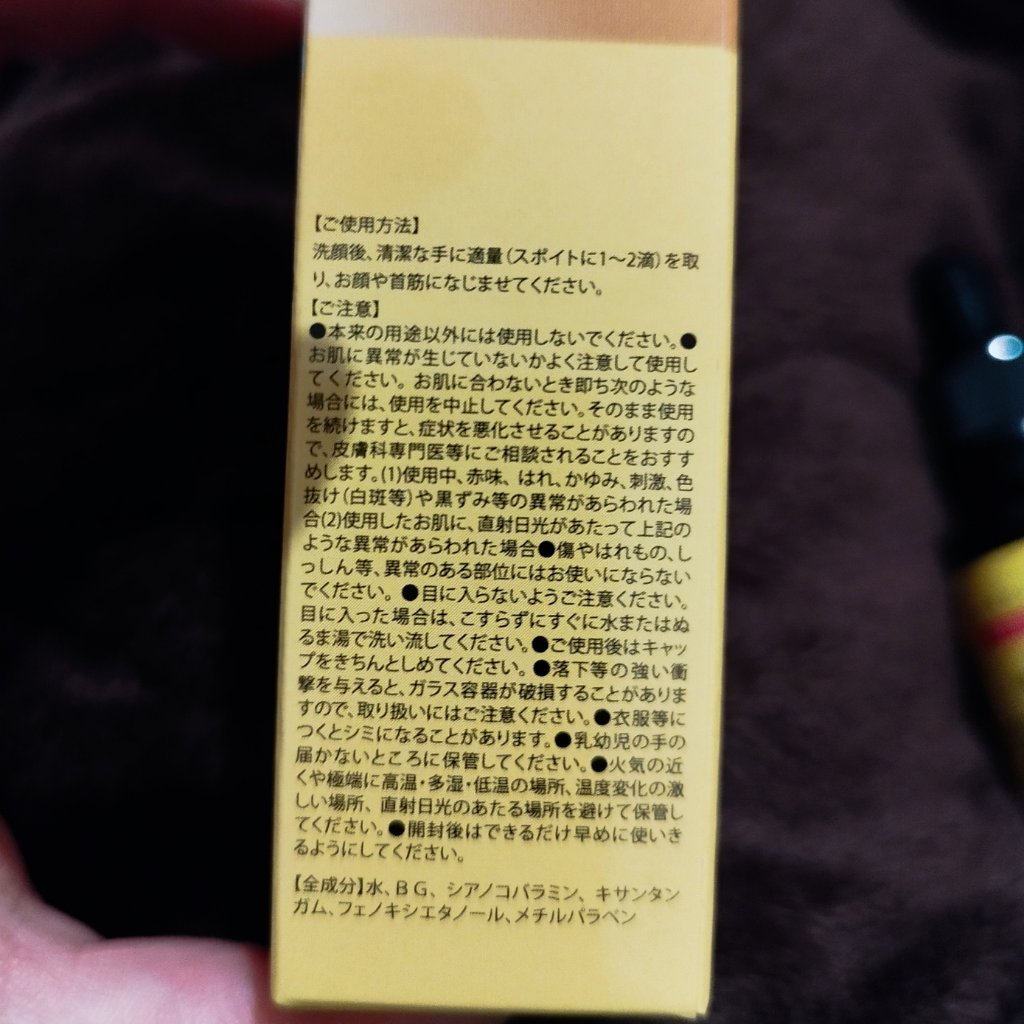 ビタミンCでさっぱり系の美容液です。 刺激がほぼ無いし安かったので惜しみなく使えました。 スポイト1回で首にもしっかり塗れました。 うっすら柑橘系の香りします。 ラベルが剥がしやすかったです!