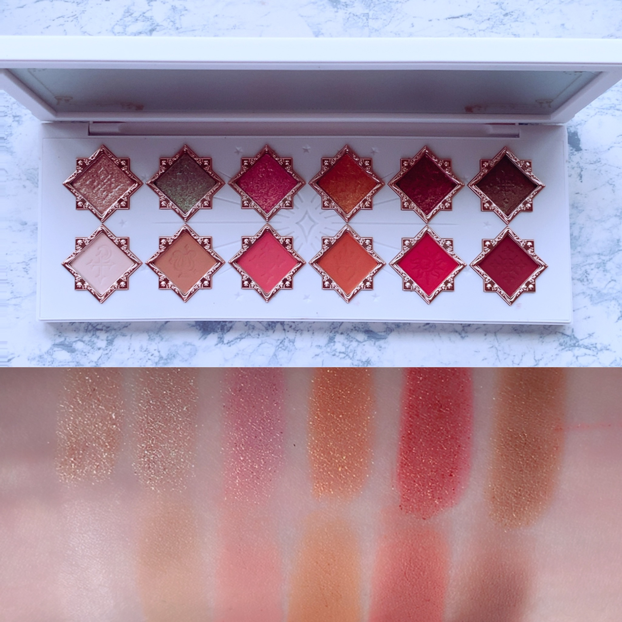フラワーノーズのパケは本当にゴージャスでステキ ごつくて収納に優しくないけどここまで振り切ってればもう仕方ない 粉質はふわさら系 発色もひかえめ 彩度抑えたパレット ミュートメイク向けですかね🤔 その分ラメがもうギラッギラ でも下品なギラギラじゃないのがうまく作ってるよね✨