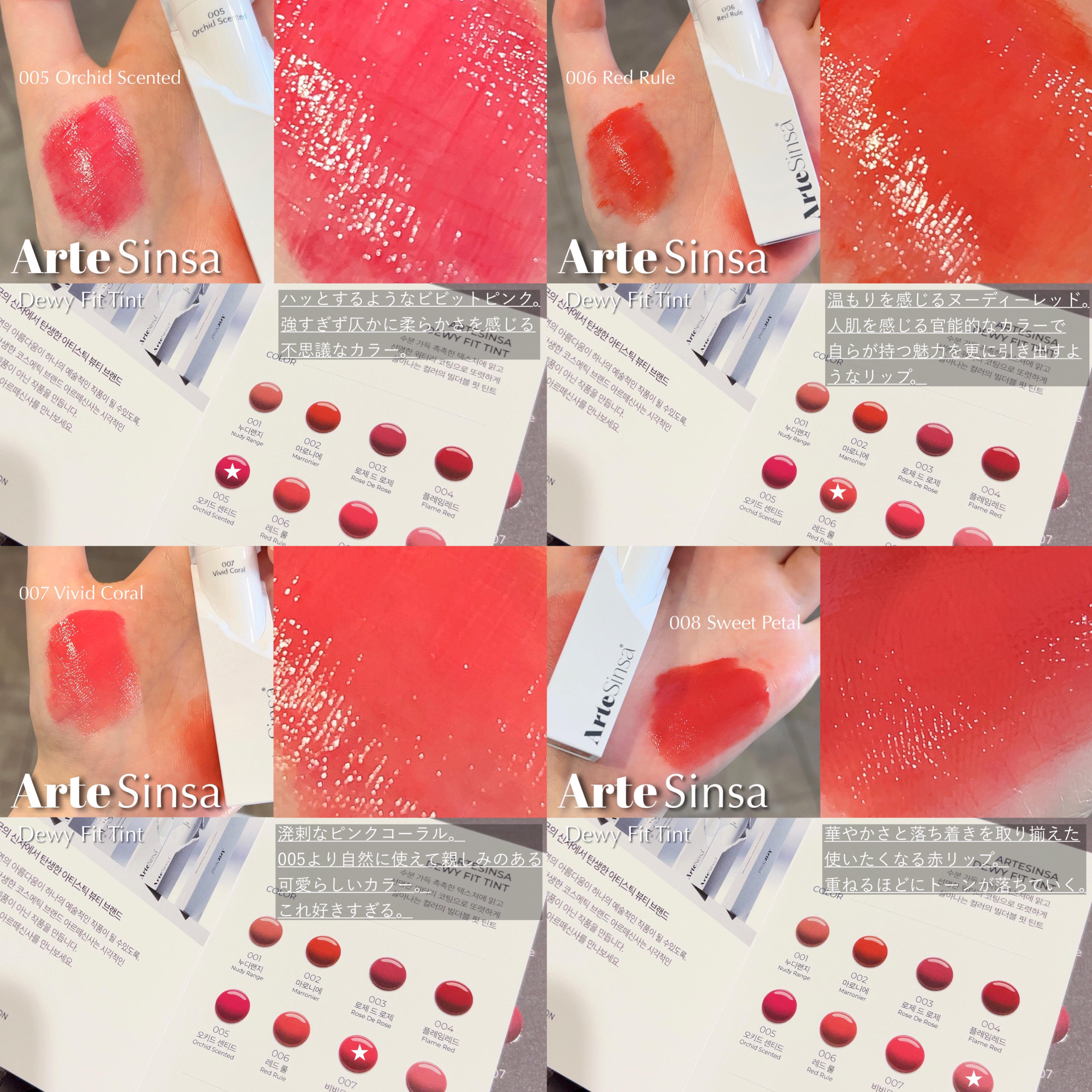 - 【Dewy Fit Tint 】は「彫刻ティント」で話題となったArteSinsanのシグネチャーティント 001/005カラーはリニューアルカラーで登場! 水分たっぷりのしっとりしたテクスチャーにウォータリーコーティングで鮮やかな発色に立体感を与えてくれます。 長持ちする着色力と高い保湿力を兼ね備え、唇に優しい使い心地で使用でき密着力も◎! まるでアーティスティック彫刻のようなティントです。
