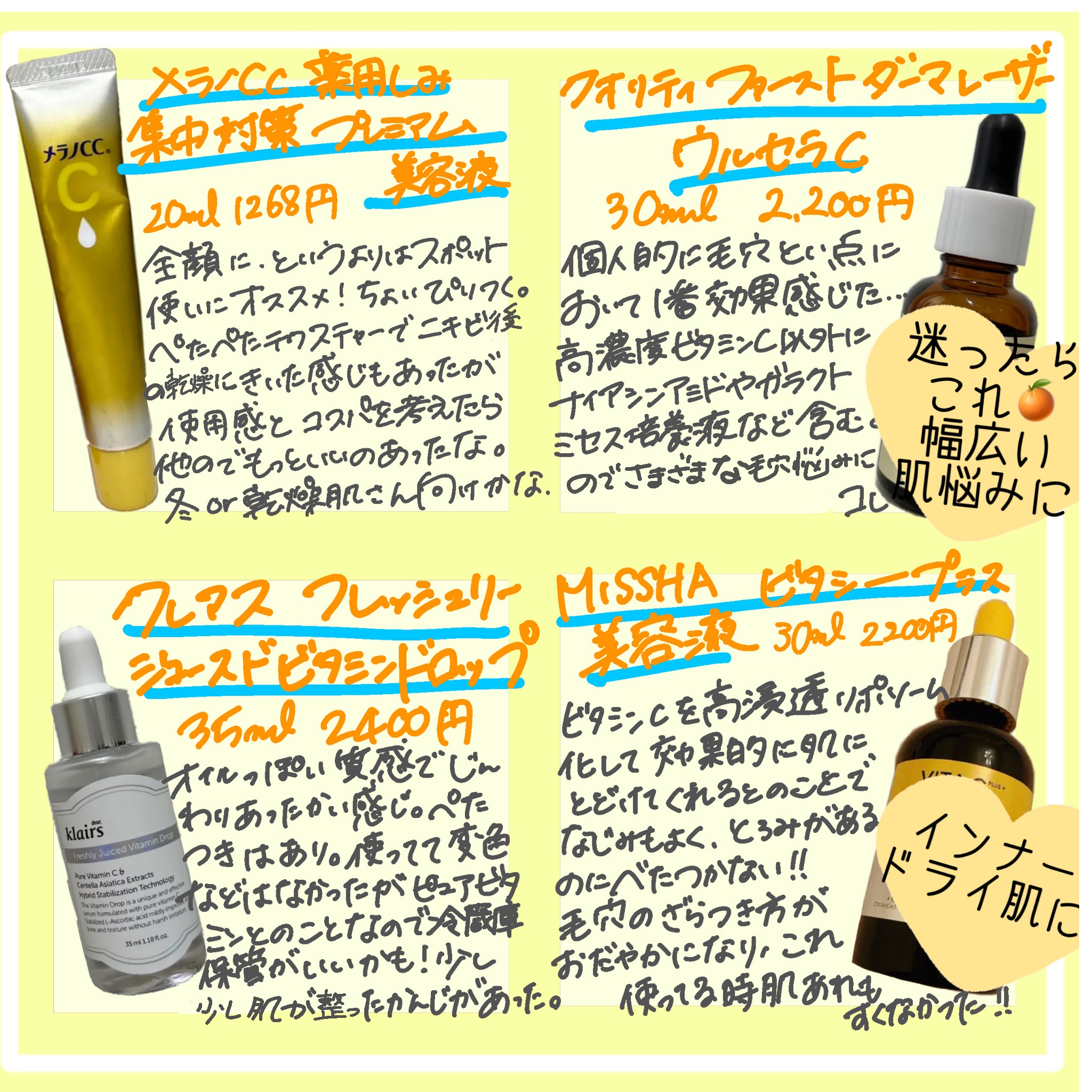 朝ビタミンCの化粧品使うとビタミンCには抗酸化作用があります。 それが肌荒れ防止などに繋がったりするんですね💪💪💪 また肌のバリア機能の要でもあるセラミドくんを作るのを助ける為肌治安の維持にもいい! ビタミンC誘導体にしたり、リポソーム化したり各社いろんな方法をとってますのでそれぞれひと口にビタミンCといってもテクスチャーや使用感は全然違う!!!!! ビタミンC美容液と言ってますが他にも成分入ってるものが多いので中の成分を気にして選ぶのもいいかも。 クオリティファーストのダーマレーザーウルセラCがおすすめ!!!!!!🍊🍊🍊🍊🍊🍊🍊🍊 ナイアシンアミドとビタミンCの組み合わせも最高ですし、肌治安がよくなり(肌触りもよくなる)毛穴が落ち着いた感じがある(開きや皮脂の出方) 乾燥やベタつきもないのでどんな肌質も使えると思いますし、ナイアシンアミド高濃度ですがナイアシンアミド自体は刺激の少ない成分なので敏感肌の人でも刺激に感じることは少ないです☺️☺️
