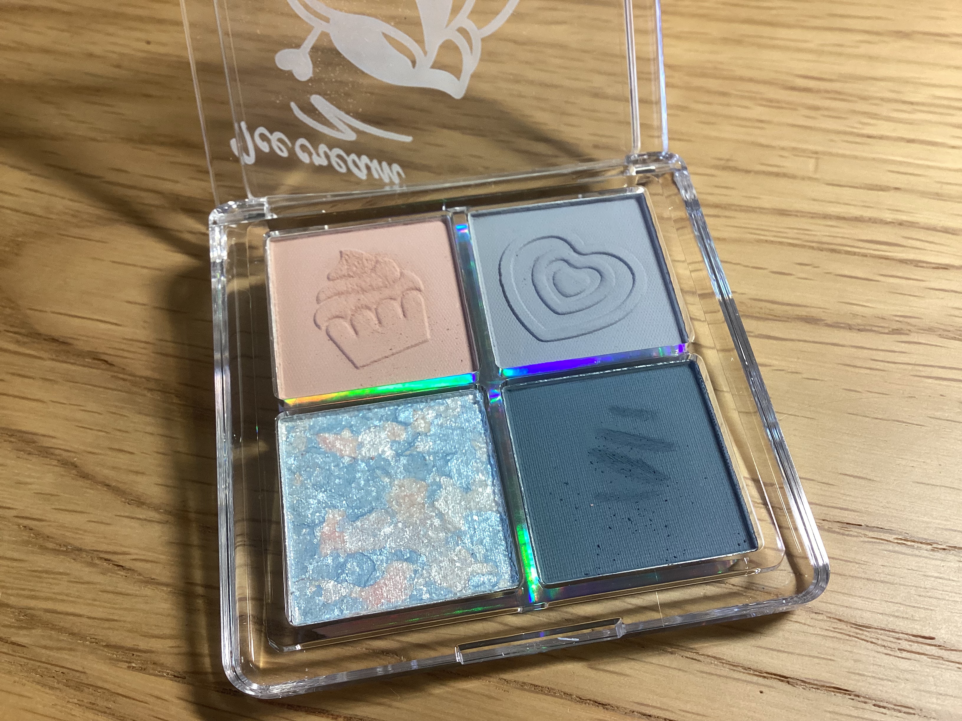 お値段500円。前回は多色のアイシャドウパレットを紹介しましたが、今回は4色入りのスタンダードなタイプ。 中を開けてみるとアイシャドウに星、ドーナツ、カラースプレーの絵が彫ってあります。 粉質は前回のアイシャドウ同様しっとりしてて粉飛び知らず。チャイボーグメイクなど濃いメイクしてる私にはぴったりのアイシャドウです。