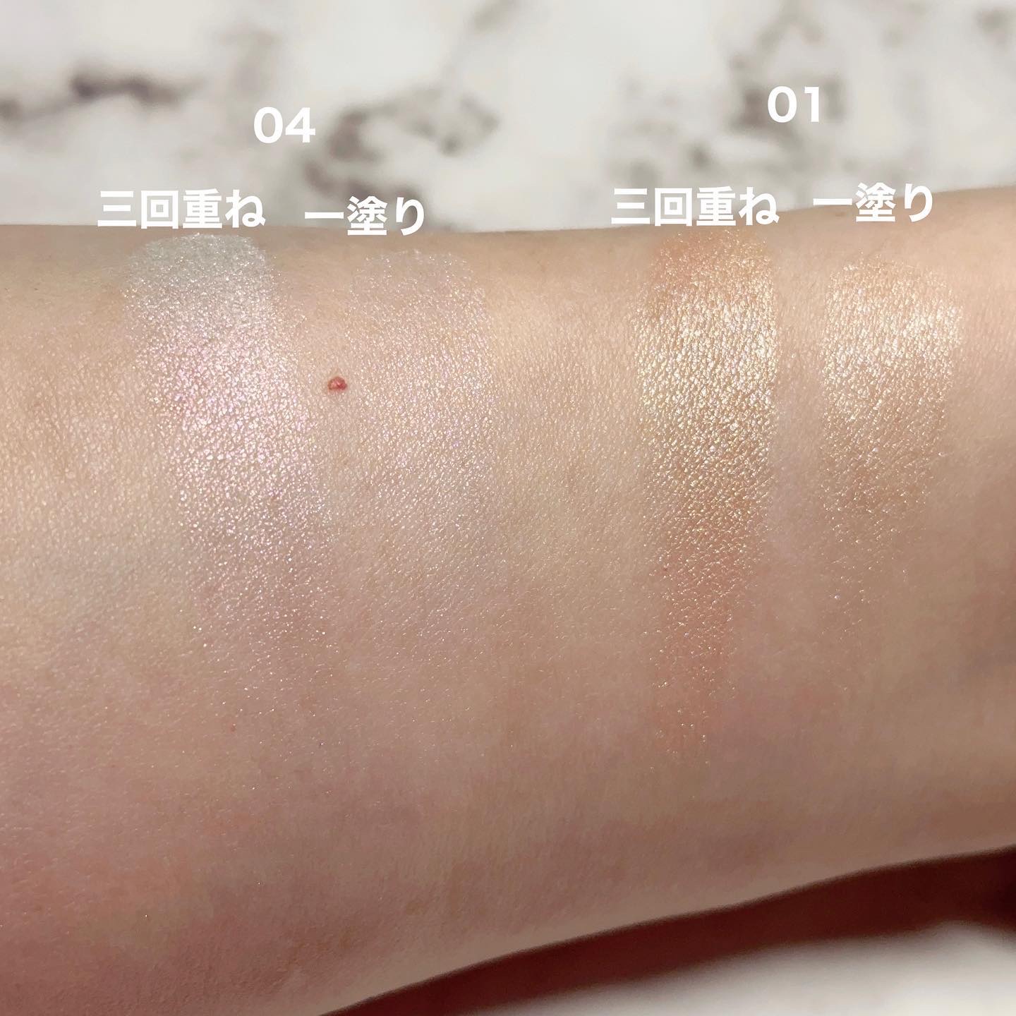 テクスチャーはサラサラだけど、飛び散るわけではなくて吸い付いてくる感じでした。 グリッターは、湿式のウェットさと押すとムニっとして、ちょっとゼリーテイストな気がします。ギラギラすぎなくて使いやすかったです。 ⑥はピンクも混ざっていてとても可愛い。アイスクリーム屋さんのストロベリーチーズケーキみたいな🍓これも、白すぎなくて肌馴染みの良い白系なので使いやすかったです。
