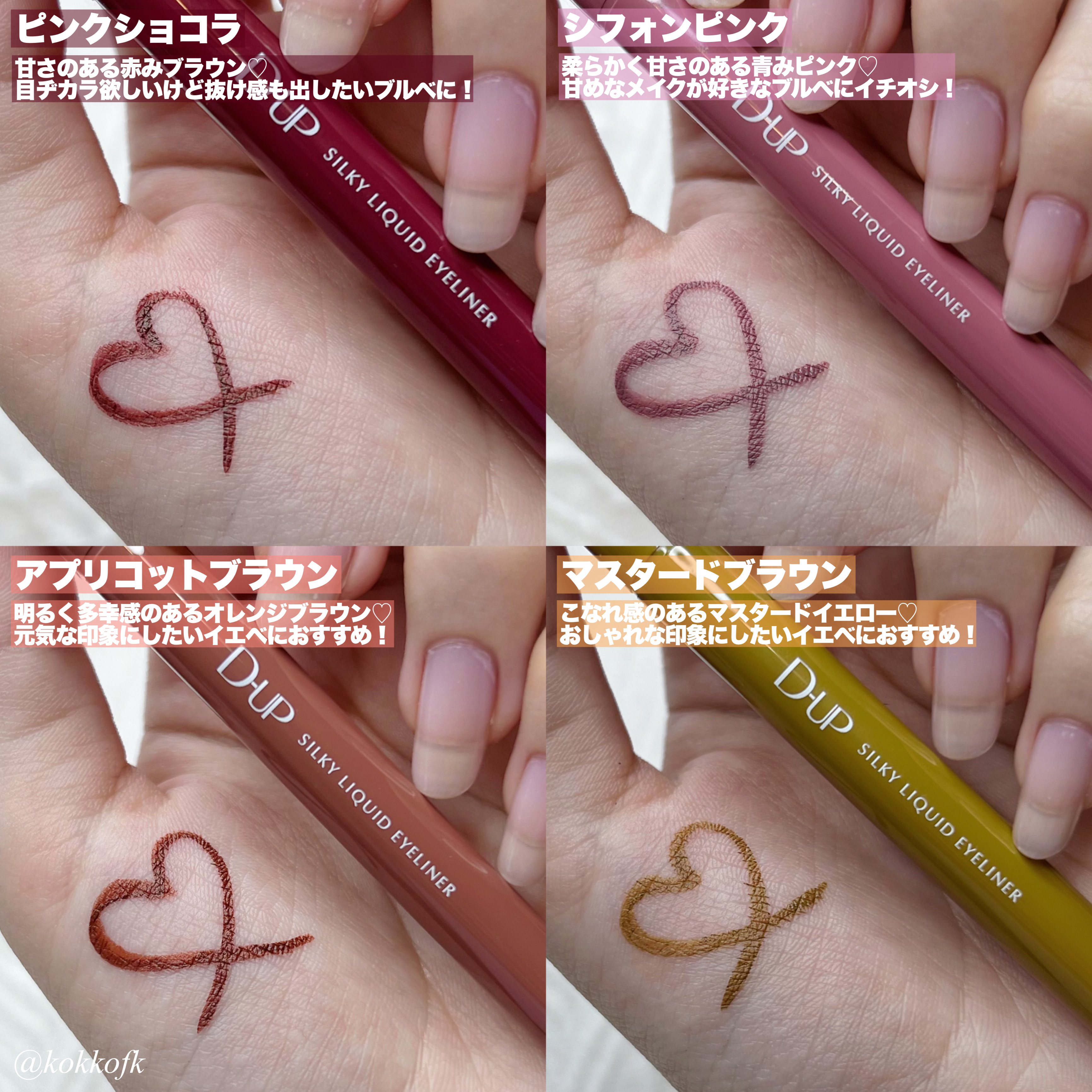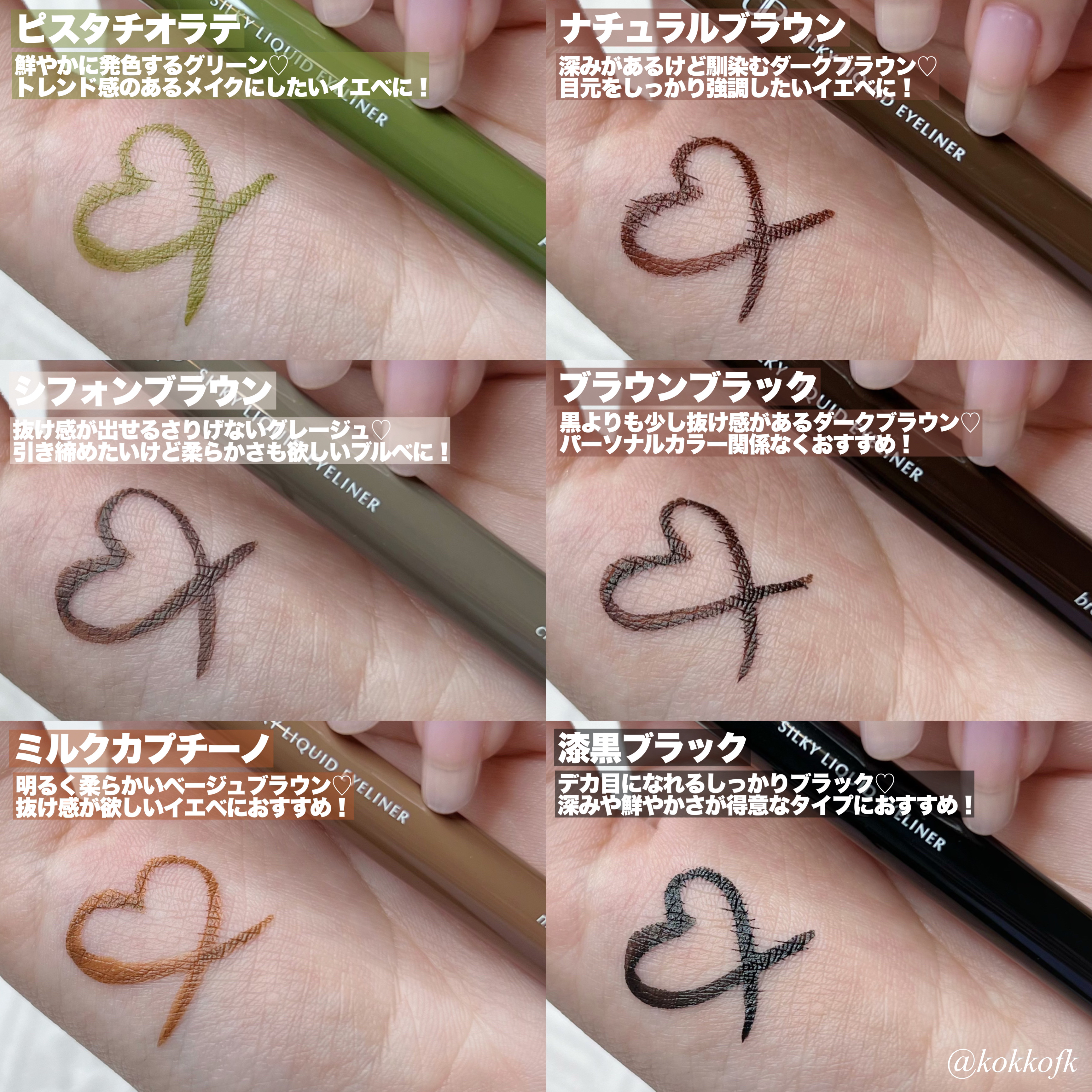 - 筆先までずっとなめらか、目尻で感動するリキッドアイライナー。 必要な量が肌にのる新設計で、まぶたの上をすべるような、滑らかな描き心地。しなやかでコシのある筆が、筆圧のコントロールを容易にし、太いラインも細いラインも思い通りに仕上げます。水、汗、涙に強いウォータープルーフタイプなのに、通常洗顔で簡単オフ。肌に色素が残らない顔料を使用。5種類の美容液成分を従来品の200%配合し、メイクしながら目元ケアまで。 ●ブラウンブラック ※2020年9月12日 バラエティショップ先行発売 ●漆黒ブラック ※2020年12月頃発売予定 ●ナチュラルブラウン ※2020年12月頃発売予定 ●シフォンブラウン 「毎日メイクに透明感と抜け感」 ブラウンでも、グレーでも、ベージュでもないニュアンスカラー。 自然な印影で素の目元を際立て、頑張りすぎない、ふんわりとした目元に。 ●アプリコットブラウン 「じゅわっと血色感。 肌に馴染むおしゃれカラー」 温かみのあるアプリコットがじゅわっと滲む血色感を目元に演出。 肌馴染みが良いので、カラーライナーに抵抗がある方もブラウンの延長線上で楽しめる、使いやすい色味です。 ”ちょっとオシャレ”な空気感を演出するカラー。 ●ピンクショコラ アイライナー 「ピンクが溶け込む濃厚ブラウン」 肌馴染みが良く、目元にじんわり血色感をプラス。 さりげなく女性らしさが加速するようなカラー。 ●ピスタチオラテ (2022年7月29日(金)発売) 「“目尻”に抜け感アクセント」 肌に馴染むのに映える絶妙なグリーン。 トレンドカラーに“くすみ”と“抜け感”をプラスしたまろやかな発色。 ●マスタードブラウン 「“イエロー”が揺れる、大人の洒落色」 (2022年7月29日(金)発売) まるで太陽のような暖かさを感じる新しいブラウン。 ほんのり感じるイエローでメイクが一気に垢抜ける稀有な色。 ●シフォンピンク(2023年2月10日発売) 「ふんわり柔らか"まろみピンク"」 甘くなりすぎない青みニュアンスで目元の透明感UP。 目元を引き締め、ピンクメイクにありがちな腫れぼったさを解消。 ●ミルクカプチーノ(2023年4月21日発売) まろやかな深みの“優しい締め色” どんなメイクにも合わせやすいカラー。 自然な陰影でさりげなく目幅を拡張します。 ●グレーカシミア(2023年10月1日発売) ブラウンがほんのり溶け込んだ、暖色グレー まろやかな発色で、パーソナルカラーを問わず肌に馴染む 目元の陰影になりすまし、抜け感と目力を欲張りに叶える ●ダークフィグ(2024年6月1日発売) するする”なめらか。描きやすいのに、落ちにくい。 クッキリ可愛いほの甘ダークブラウン ●ピーチモカ(2024年8月1日発売) ふわっと自然に盛れる“桃色ブラウン” ほんのり血色感で目元にうるみ感を演出 ●スターダストブラウン(2024年12月11日発売) キラッと繊細に輝く''星屑ブラウン'' 透け感のあるダークブラウンの色味とラメの輝きが、目元に艶のある立体感を演出 ●チャコールモカ(2025年4月10日発売) 目元を締める''深みグレージュ'' 黄みや赤みに偏りすぎない絶妙な色設計で、自然に目元を強調