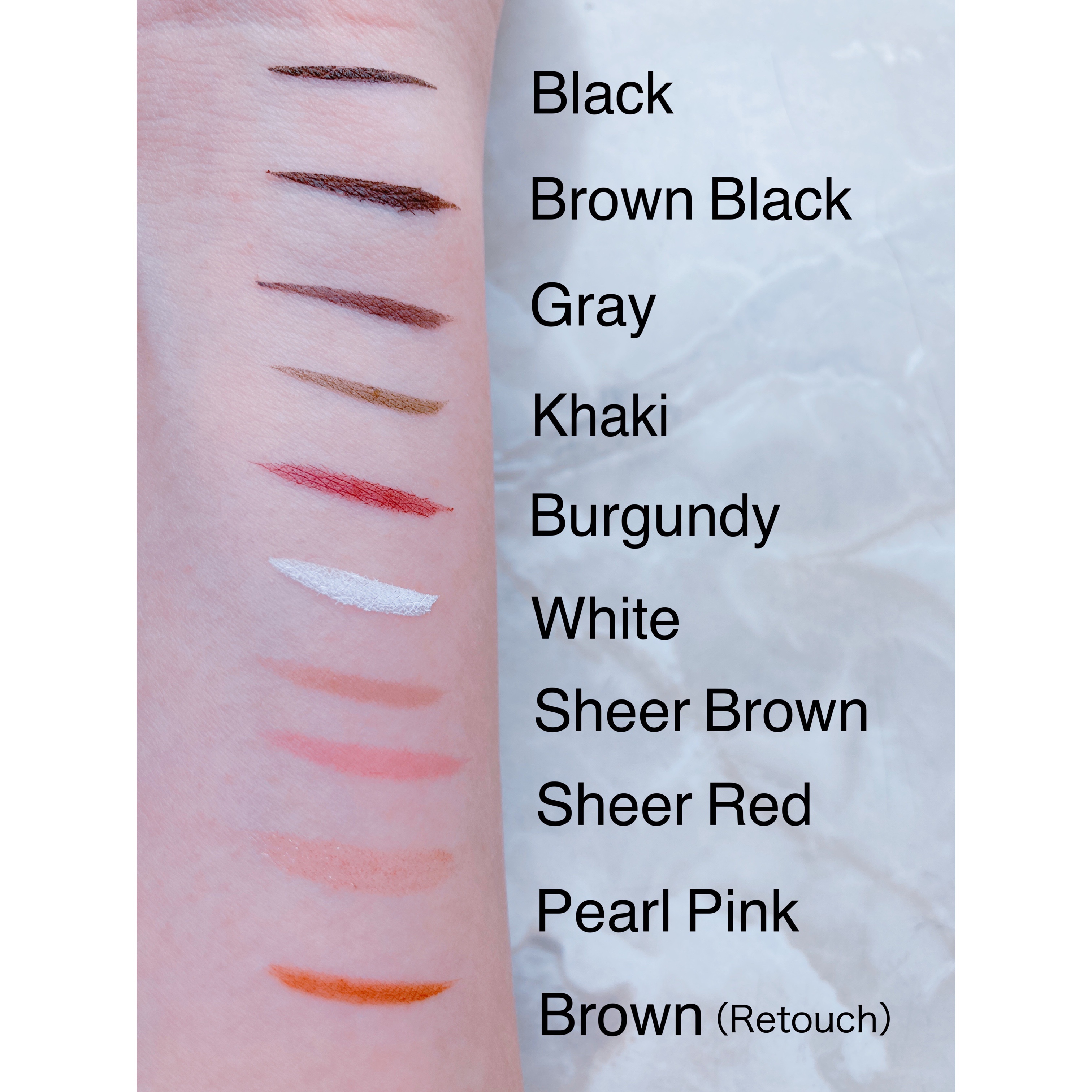 - 〇まつげ美容液成分配合 アイライナーを引くたびまつげケア。厳選した4種類の美容液成分配合。 オタネニンジン根エキス・パンテノール・ビワ葉エキス・パールエキス*1(すべて保湿剤) 〇Wプルーフ処方&お湯でオフ 涙・汗・皮脂・こすれに強く、にじみにくいウォーター プルーフ&落とす時はこすらずお湯オフできる スマッジプルーフ処方 〇筆職人監修の匠筆 筆職人による異なる3種類の毛をブレンドしたこだわりの筆。 まぶたへの優しいタッチと、コシのある絶妙な描き心地。 〇ダイヤモンドフォルムが手ブレを防ぎ、こだわりの描きやすさを実現 〇コンパクトで、ポーチに入れやすい 〇速乾タイプで、まぶたにつきにくい 〇抗菌*2ボトル採用 〇アレルギーテスト済み*3 〇独自開発素材 VIRUTEXを採用 抗菌効果を持つVIRUTEX を使用した容器で、樹脂からの抗菌成分溶出により、菌の検出を防止します。*すべての菌に有効性を示している訳ではありません。(抗菌性試験(JIS)による判定) ご使用中に付着した汚れは拭き取って、清潔に保ってください。 *1加水分解コンキオリン *2全ての菌に有効ではありません *3全ての人にアレルギーが起こらないわけではありません <カーキ(Khaki)> モードカーキ 肌なじみがよく普段のメイクにアクセントを加えた仕上がり。モードでかっこよく上品な印象の目元に。 <グレー(Gray)> 柔らかニュアンスグレー 黒よりもインパクトが強すぎず、ブラウンほど柔らかすぎないナチュラルな仕上がり。 <シアーブラウン(Sheer Brown)> 仕込みシアーブラウン こっそり仕込むコントゥアラインで目元に立体感。二重強調ラインや涙袋の影に。 <シアーレッド(Sheer Red)> 血色感シアーレッド 内側からにじみでるような血色感。涙袋の影やベースに引くことでうさぎメイクに。 <バーガンディー(Burgundy)> 目元染めるバーガンディー 目元に血色感を与えるカラー。ひと筆で体温が上がったような、きれいであたたかさのある仕上がり。 <パールピンク(Pearl Pink)> 煌めくパールピンク アイライナーの上に重ねたり、涙袋やハイライトにも煌めきを。狙った場所にパールを細かく表現。 <ブラウンブラック(Brown Black)> 王道ブラウンブラック 黒だと強すぎ。でもブラウンじゃ物足りない。ぬくもりと凛々しさの絶妙の色バランス。 <ブラック(Black)> 定番ブラック 黒目の印象をどこまでも引き立てる、引き締めブラック。 <ホワイト(White)> 目元拡張ピュアホワイト 拡張色で大きな目元を演出。しっかり発色するホワイト。抜け感あるピュアな印象に。