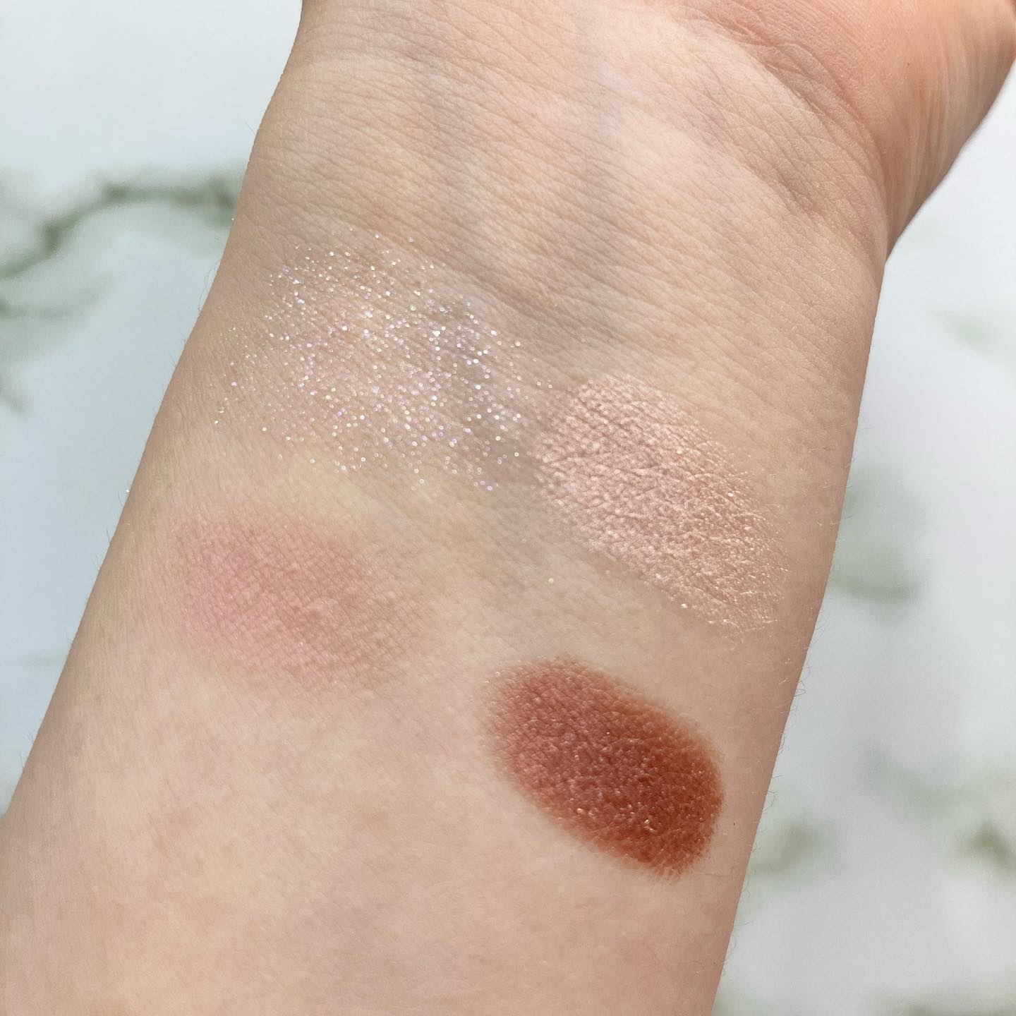 アイシャドウとハイライトがセットになった便利パレット! 2022年大人気だった限定カラーが復活して定番色に! どうみても誰もが使いやすいし好感度高い配色💗 暖かみのあるベージュトーンパレットでどう使ってもナチュラルで抜け感のあるメイクに✨ ラメは細かく繊細だから派手になりすぎず上品☺️ 他の3色はかなり似た色だから簡単にグラデーションが作れるよ! ハイライトはパール感があってツヤッツヤ✨ ベージュトーンのハイライトだから肌馴染みも抜群! 自然なツヤ感と立体感を作ってくれるよ😆