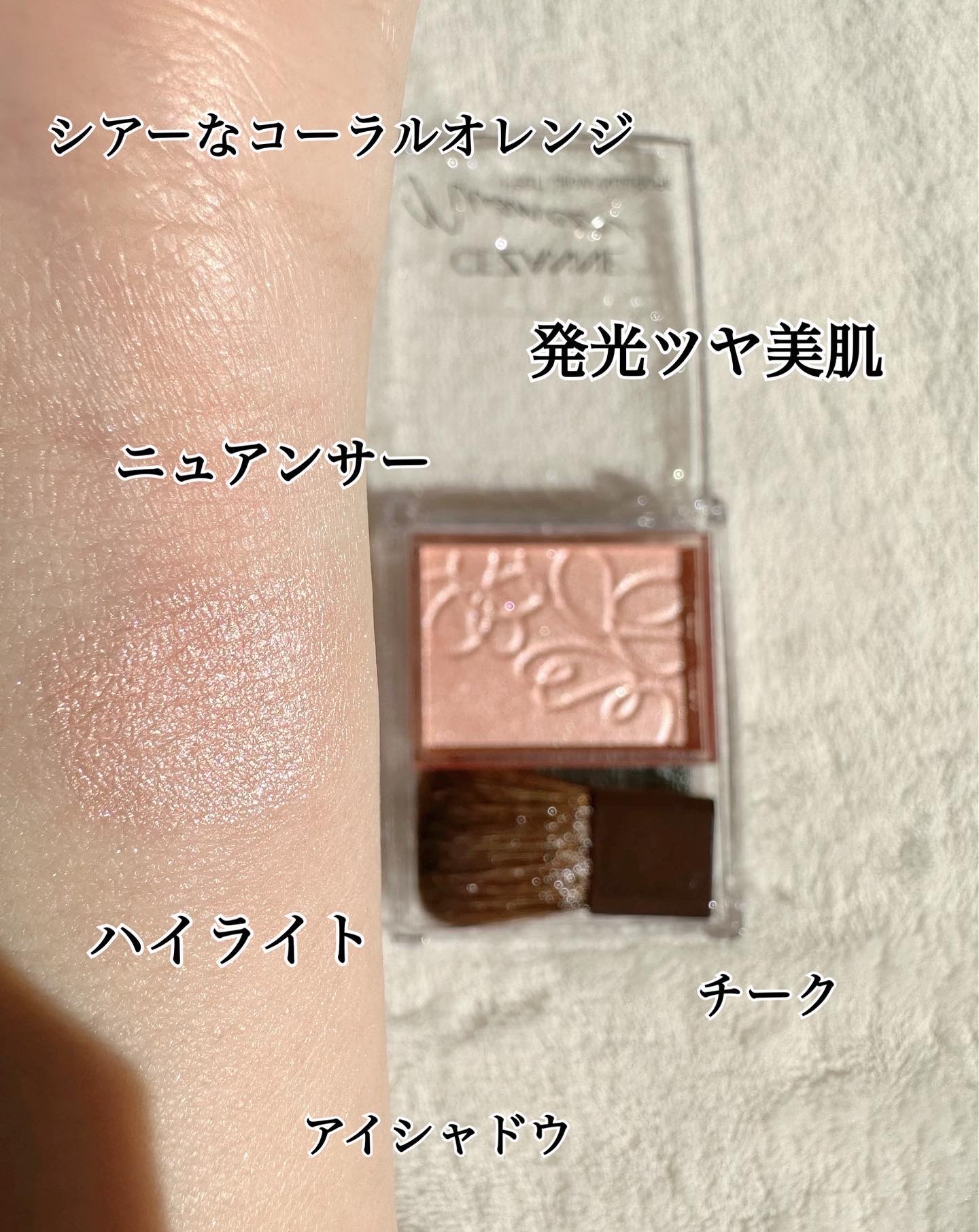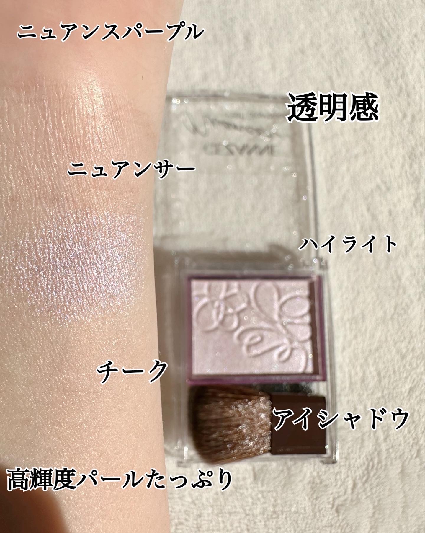 透明感あふれるライラックカラーの輝きをふんわり足してくれるニュアンサー✨ 色味も輝きも強すぎないのでどんなチークとも合わせやすいと思います スウォッチは付属のブラシで塗りました 動画は照明の当たる所で撮影しました
