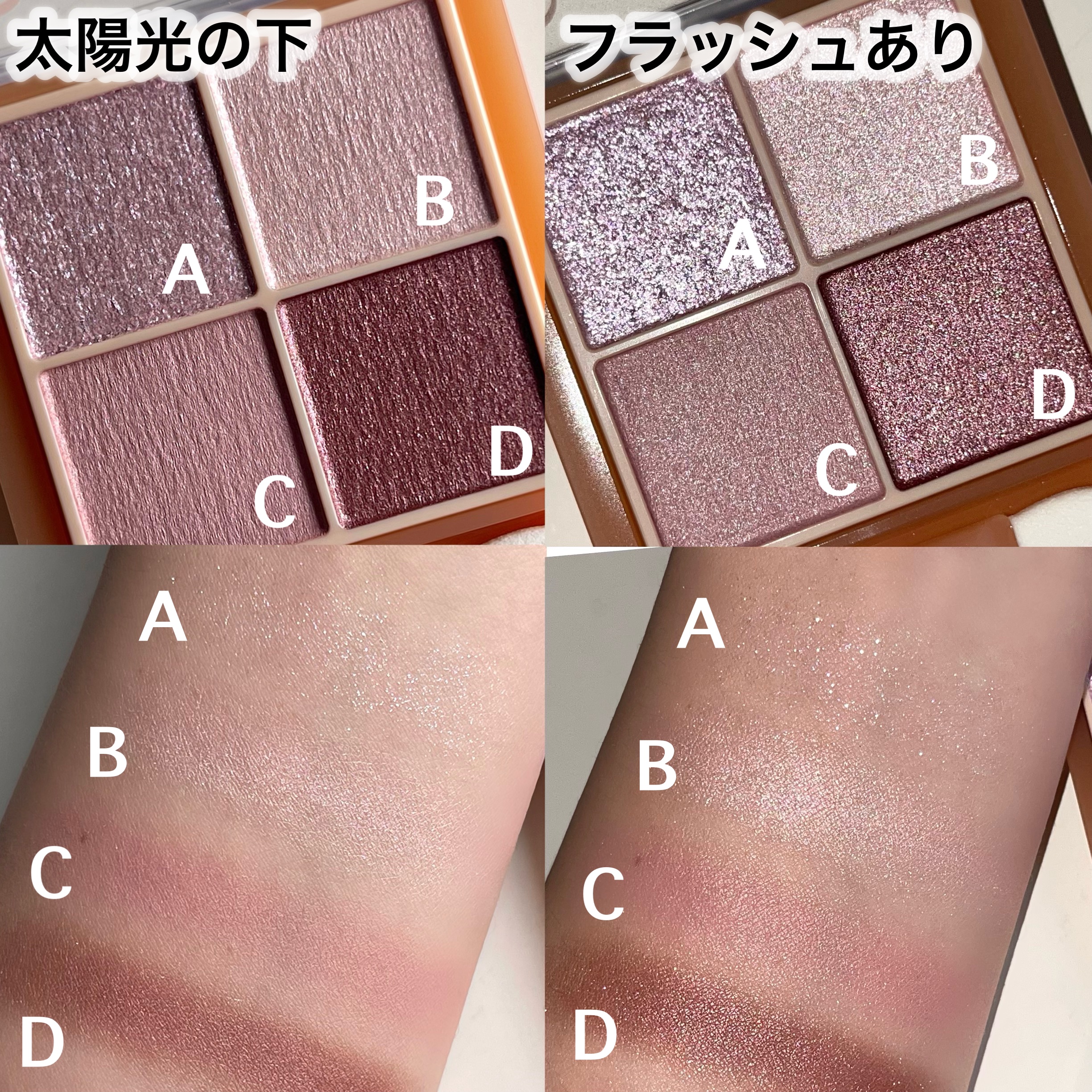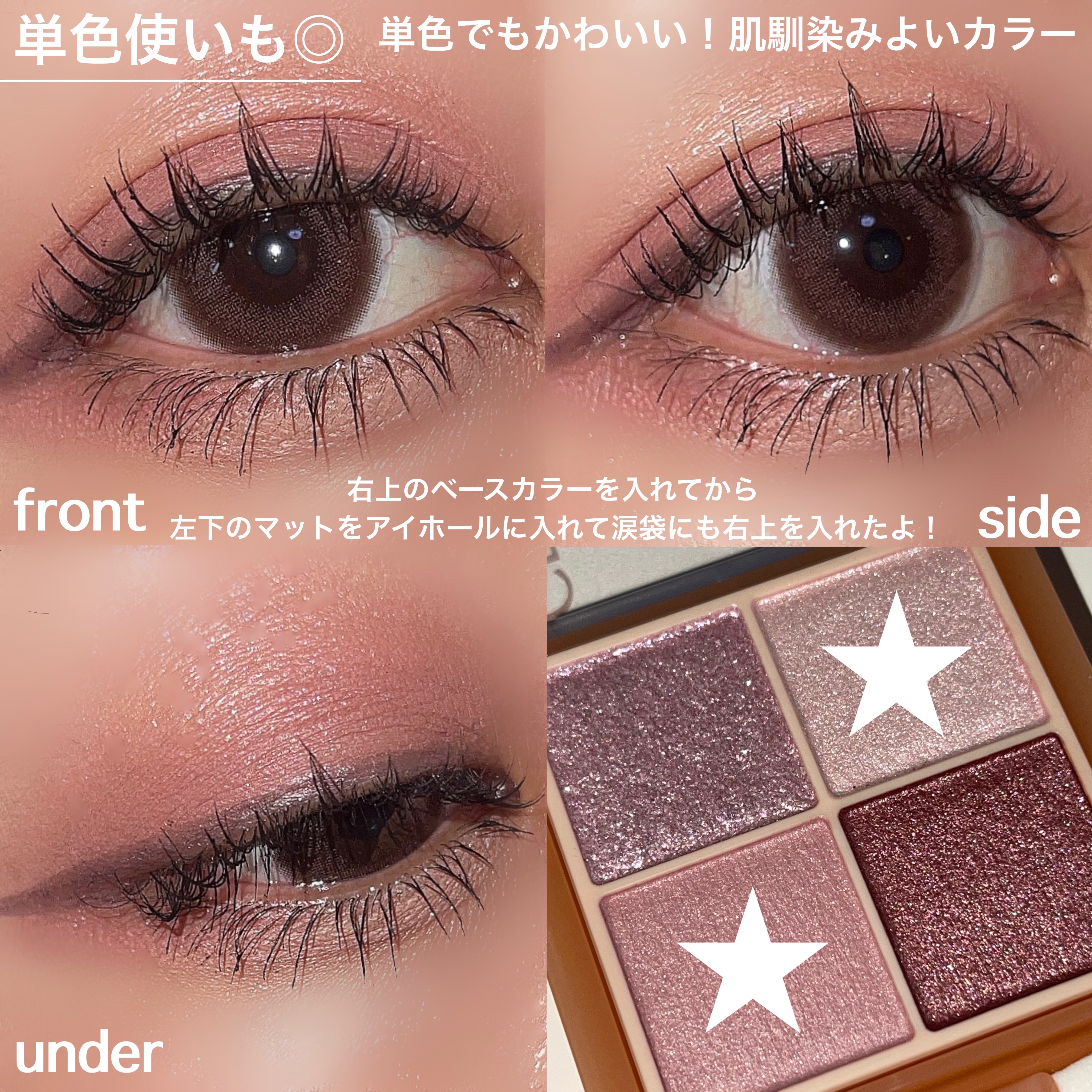 - ラメ・パール・マット3質感の4色アイシャドウ。 肌馴染みの良いベージュを基調としたカラー。ラメ・パール・マットの3質感を重ねて、自然にまぶたを強調し奥行のある大きな目元へ。 しっとり溶け込むような柔らかなパウダーなので、スルスル伸びてまぶたにピタッと密着。保湿成分(スクワラン・ホホバ種子油)配合。