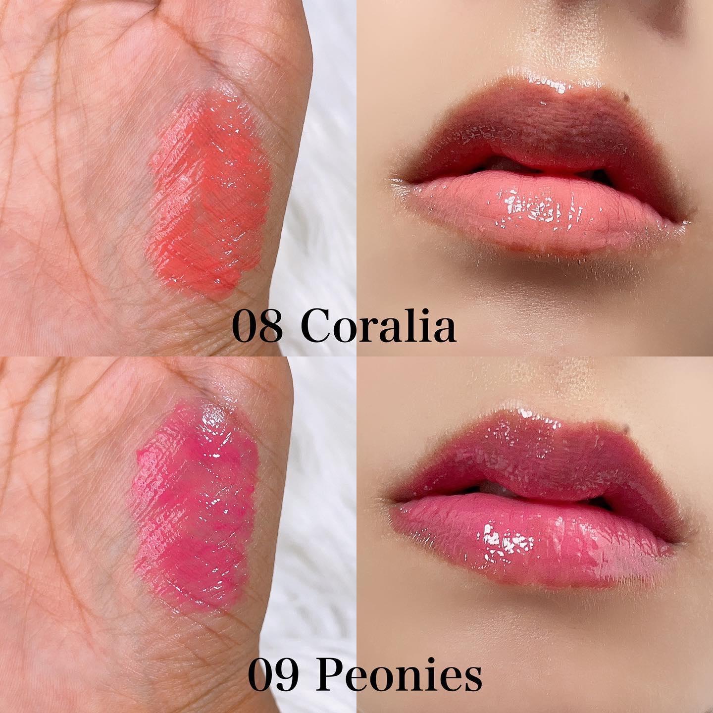 - もちっとした水膜で弾けそうなツヤリップ 1.軽い塗り心地のなめらかで透明な水爆弾ツヤ 2.塗った瞬間から唇を鮮やかに彩る多彩なカラーバーム 3.植物性保湿オイルでしっとりもっちり保湿バーム