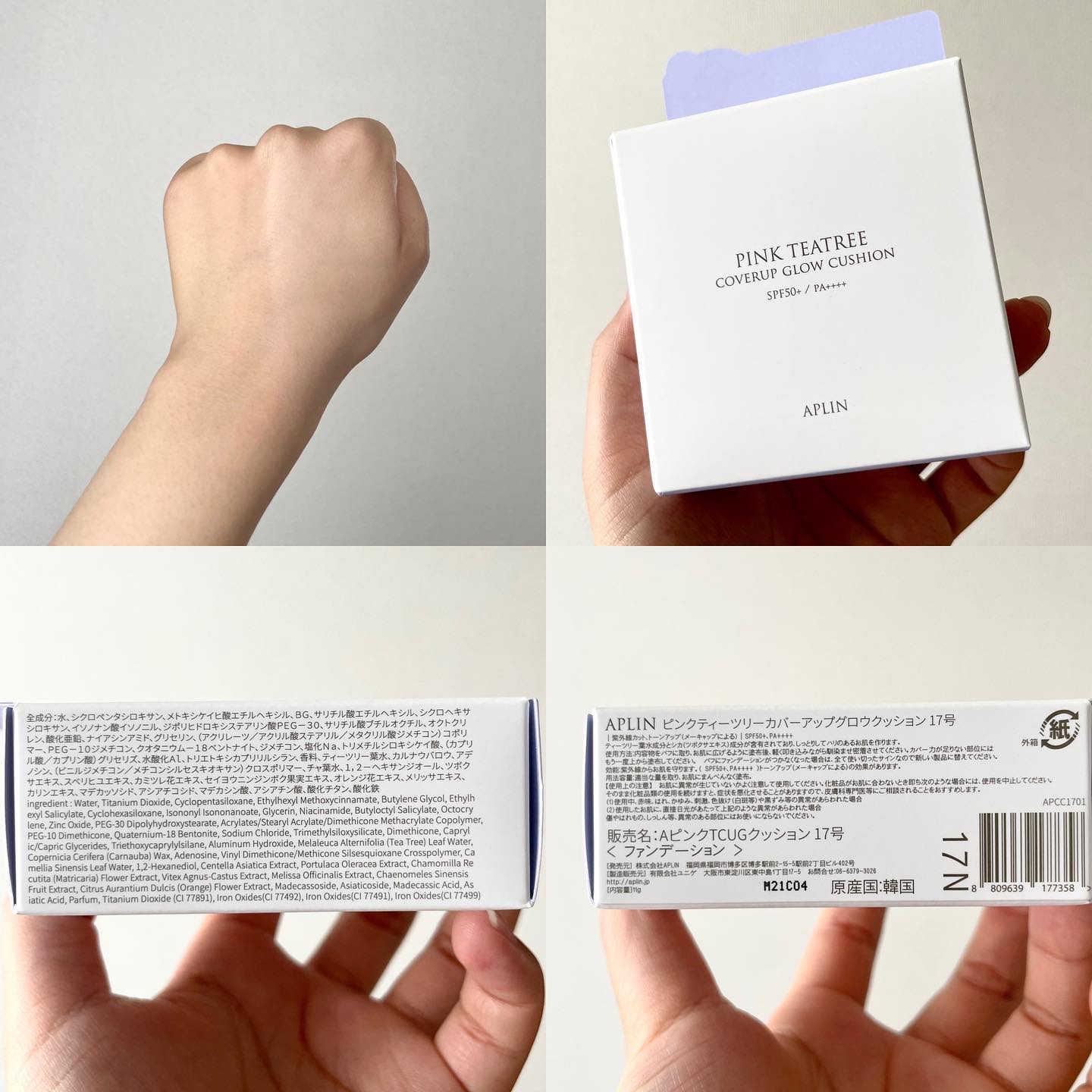 APLIN ピンクティーツリーカバークッション 21号ライトベージュ 2,490円(税込) 少量でよく伸びてハイカバー! 赤みやくすみをしっかりカバ一できるのに、厚塗り感のないなめらかな仕上がり♡ ハイカバーなのにナチュラルなツヤ感とサラッとしつつ、乾燥崩れしにくい仕上がりに感動します!!