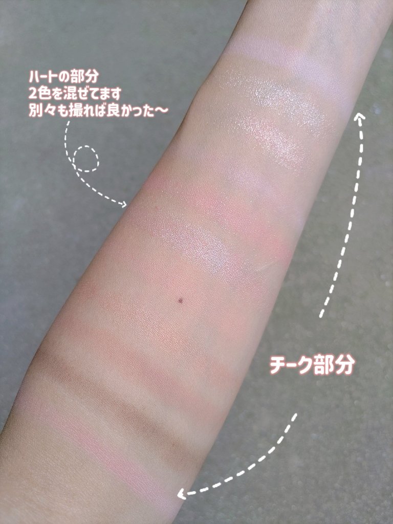 もう見た瞬間ハートの可愛さにめちゃときめいた これはもうベスコスですね! 全体的なバランスも良くてマット、ラメ、パールと一通りそろってます チークも白みのあるオレンジカラーとピーチカラー ハートの部分は白っぽいカラーとピンクっぽいカラー ピンクは結構カラーがでるのでノーズには向かないかな、頬のハイライト兼チークとしてがおすすめ