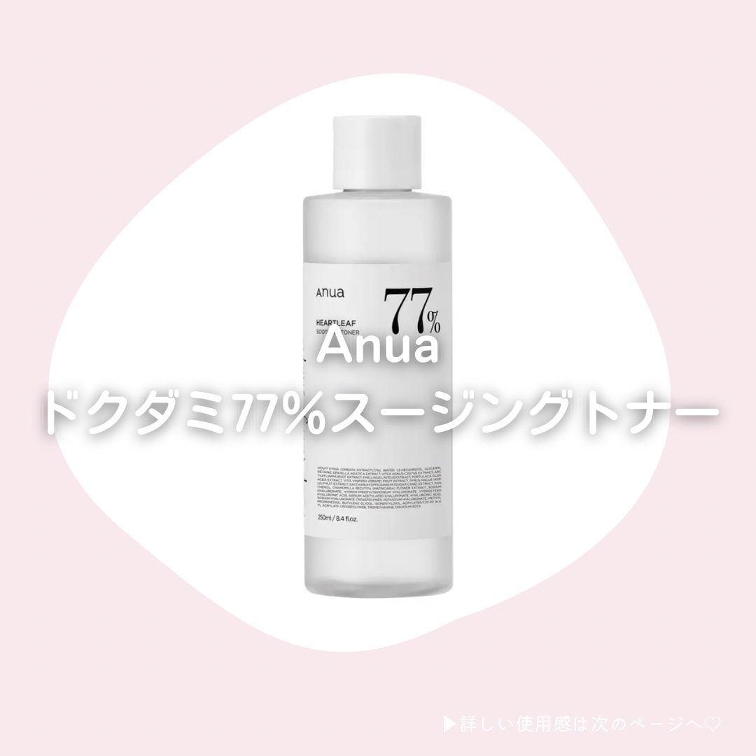 ボトルにでっかく書いてある77はドクダミソウエキスが配合されている割合のこと! ドクダミソウエキスには、抗炎症作用(炎症や赤みを抑える)や抗酸化作用(シミやシワを防ぐ)などが含まれている! でもサラッとしていて使いやすいから肌荒れしてない調子の良い日に使ってる!