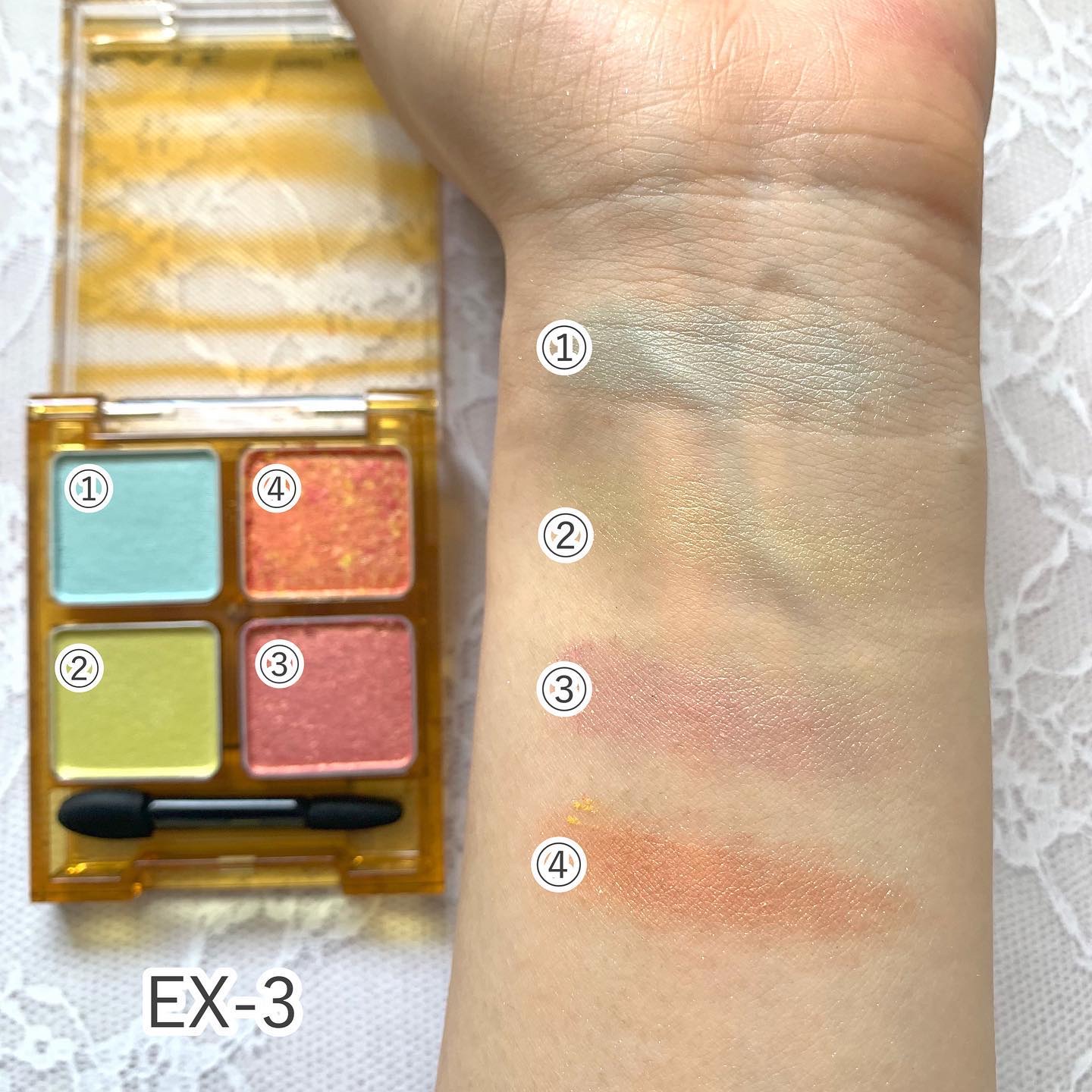 - <EX-1 ピンキーサンライズ> 合成フルオロフロゴパイト、ジメチコン、タルク、シリカ、リンゴ酸ジイソステアリル、マイカ、トリ(カプリル酸/カプリン酸)グリセリル、ラウロイルリシン、ダイマージリノール酸(フィトステリル/イソステアリル/セチル/ステアリル/ベヘニル)、スクワラン、(ジメチコン/ビニルジメチコン)クロスポリマー、ミリスチン酸亜鉛、ワセリン、セスキイソステアリン酸ソルビタン、キャンデリラロウ炭化水素、ポリグリセリル-3ポリジメチルシロキシエチルジメチコン、(ジビニルジメチコン/ジメチコン)コポリマー、トコフェロール、水、(C12,13)パレス-23、(C12,13)パレス-3、フェノキシエタノール、デヒドロ酢酸Na、クロルフェネシン、エチルパラベン、メチルパラベン、(+/-)Al、アルミナ、カオリン、グンジョウ、コンジョウ、酸化チタン、酸化鉄、水酸化Al、酸化スズ、ホウケイ酸(Ca/Al)、黄4、青1、赤202、赤226 <EX-2 スターリーナイトオーシャン> 合成フルオロフロゴパイト、ジメチコン、タルク、シリカ、リンゴ酸ジイソステアリル、マイカ、トリ(カプリル酸/カプリン酸)グリセリル、ラウロイルリシン、ダイマージリノール酸(フィトステリル/イソステアリル/セチル/ステアリル/ベヘニル)、スクワラン、(ジメチコン/ビニルジメチコン)クロスポリマー、ミリスチン酸亜鉛、ワセリン、セスキイソステアリン酸ソルビタン、キャンデリラロウ炭化水素、ポリグリセリル-3ポリジメチルシロキシエチルジメチコン、(ジビニルジメチコン/ジメチコン)コポリマー、トコフェロール、水、(C12,13)パレス-23、(C12,13)パレス-3、フェノキシエタノール、デヒドロ酢酸Na、クロルフェネシン、エチルパラベン、メチルパラベン、(+/-)Al、アルミナ、カオリン、グンジョウ、コンジョウ、酸化チタン、酸化鉄、水酸化Al、酸化スズ、ホウケイ酸(Ca/Al)、黄4、青1、赤202、赤226 <EX-3 トロピカルサニービーチ> 合成フルオロフロゴパイト、ジメチコン、タルク、シリカ、リンゴ酸ジイソステアリル、マイカ、トリ(カプリル酸/カプリン酸)グリセリル、ラウロイルリシン、ダイマージリノール酸(フィトステリル/イソステアリル/セチル/ステアリル/ベヘニル)、スクワラン、(ジメチコン/ビニルジメチコン)クロスポリマー、ミリスチン酸亜鉛、ワセリン、セスキイソステアリン酸ソルビタン、キャンデリラロウ炭化水素、ポリグリセリル-3ポリジメチルシロキシエチルジメチコン、(ジビニルジメチコン/ジメチコン)コポリマー、トコフェロール、水、(C12,13)パレス-23、(C12,13)パレス-3、フェノキシエタノール、デヒドロ酢酸Na、クロルフェネシン、エチルパラベン、メチルパラベン、(+/-)Al、アルミナ、カオリン、グンジョウ、コンジョウ、酸化チタン、酸化鉄、水酸化Al、酸化スズ、ホウケイ酸(Ca/Al)、黄4、青1、赤202、赤226