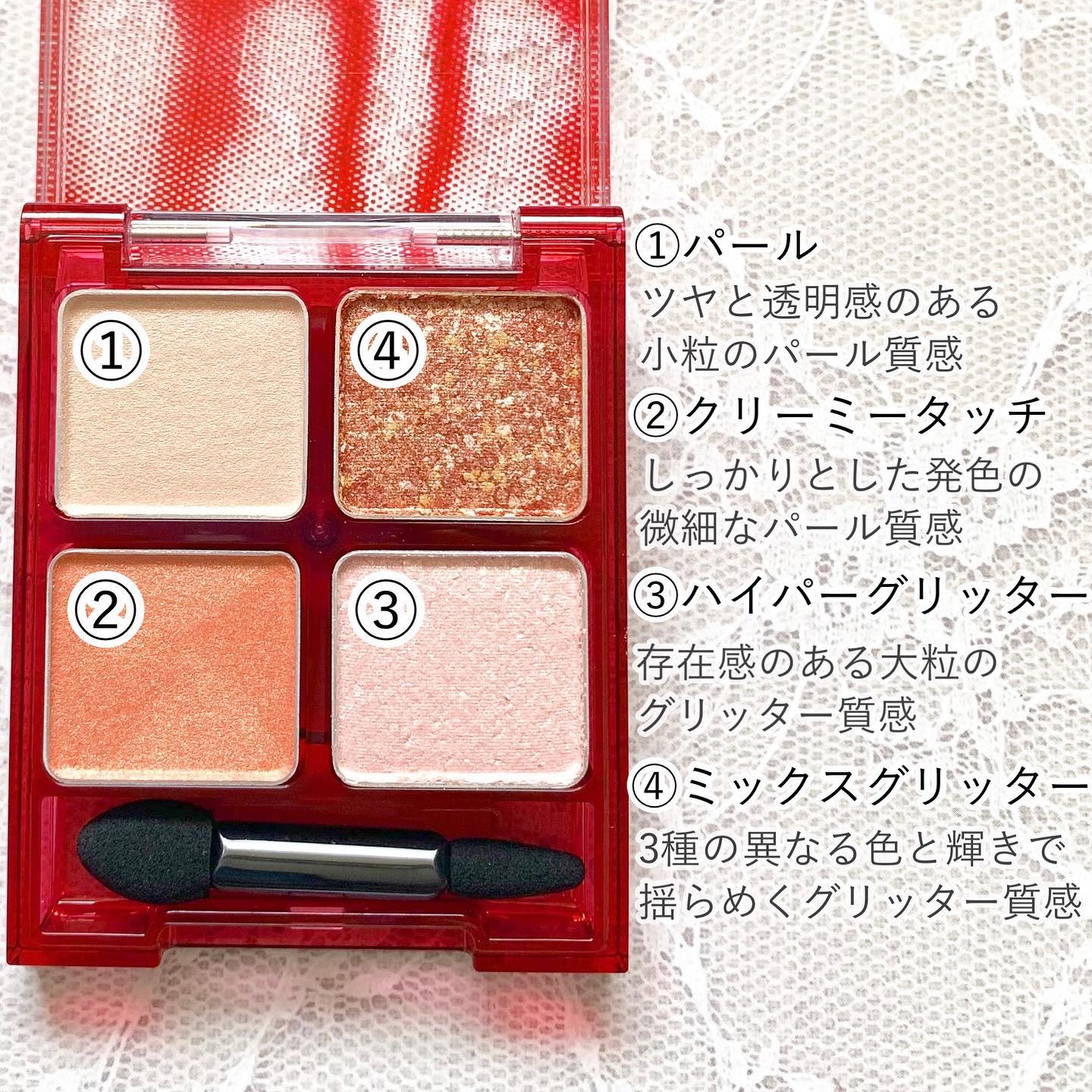 - 【数量限定発売】 きらめく水面のような輝きで目元の存在感を高めるオールきらめきパレットアイシャドウ ◆異なる輝きの組み合わせ A:ツヤと透明感小粒のパール質感 B:しっとりとした発色の繊細パール質感のクリーミータッチ C:存在感のある大粒ハイパーグリッター質感 D:3種の異なる色と輝きで揺らめくミックスグリッター質感 ◆全3種 ■パレット右側2色に採用「ハイパーグリッター処方」 ✓密着力が高い!:密着性の高いオイルを配合。パールが落ちにくい。 ✓見た目の輝度が高い!:油剤を多く、パールを高配合*することで、強い光沢感・グリッター質感を演出。 *自社従来のパール処方と比較して。