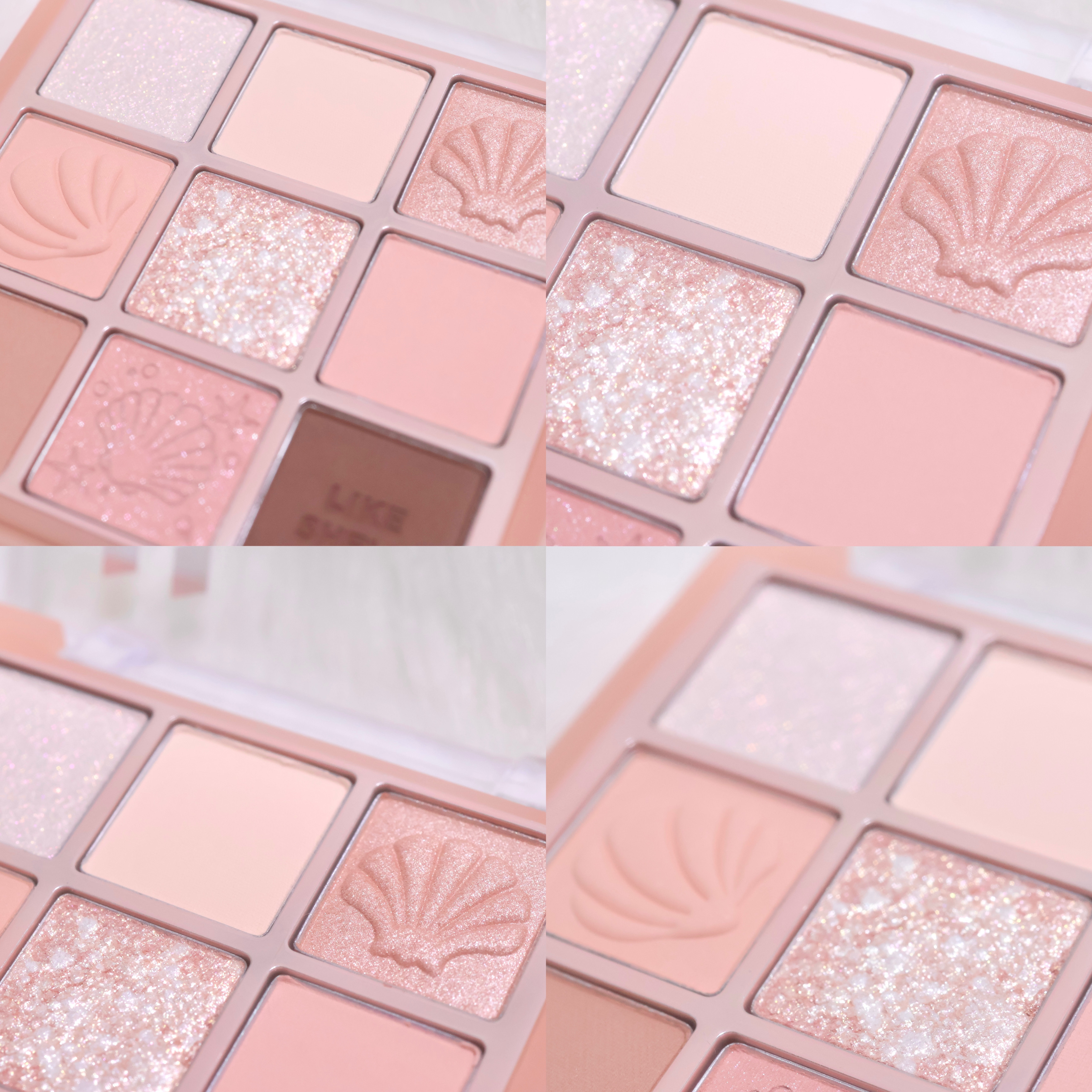9色、まんべんなく減っている。 どの組み合わせにしても、成立する。イエベ春にピッタリのピンクコーラル系。全体的に淡い仕上がり。 ほわっと仕上がり。 画像ではわかりにくいけど、ラメが美しい。 粉質がよい。 朝に付けたアイシャドウの色合いが、夕方まで持続する。