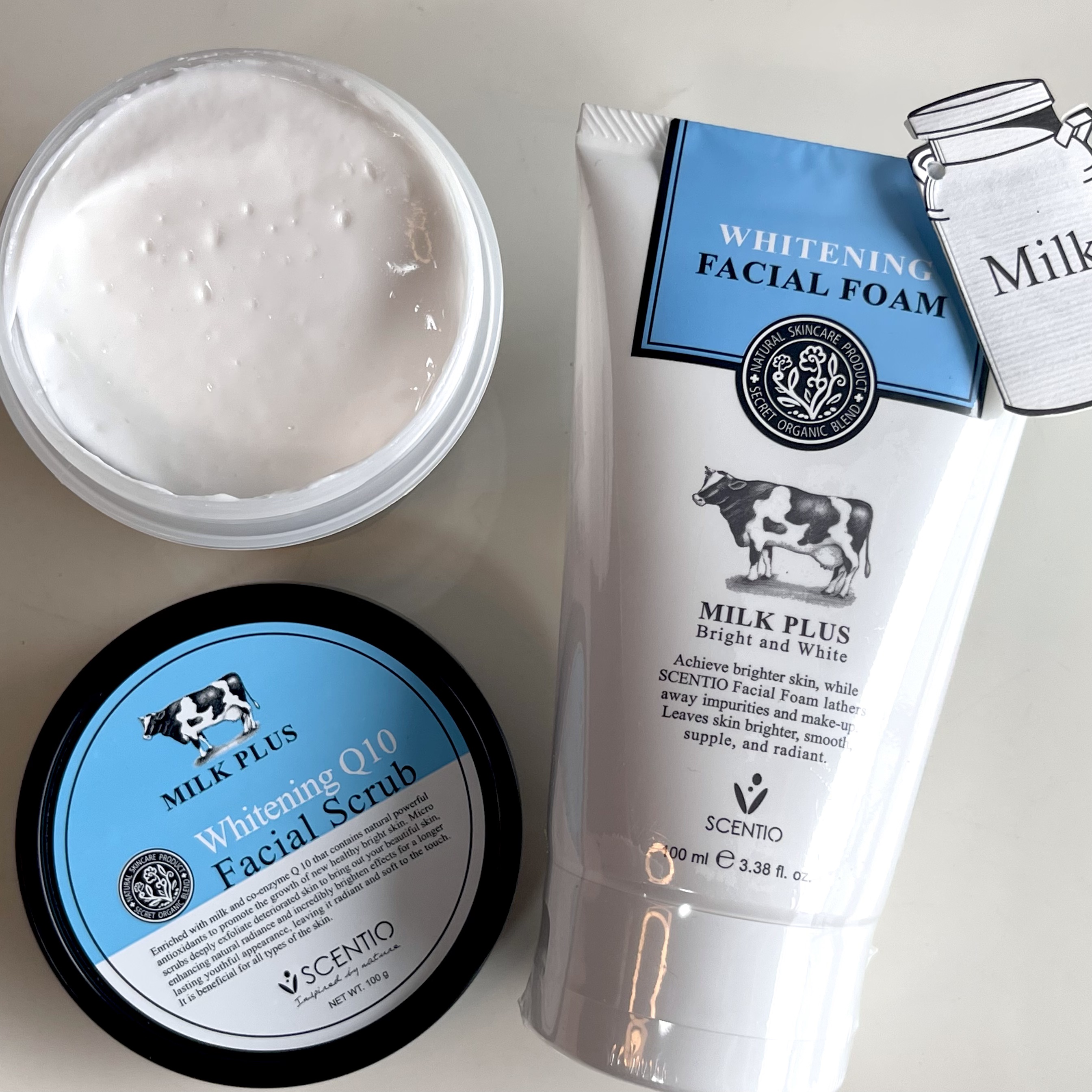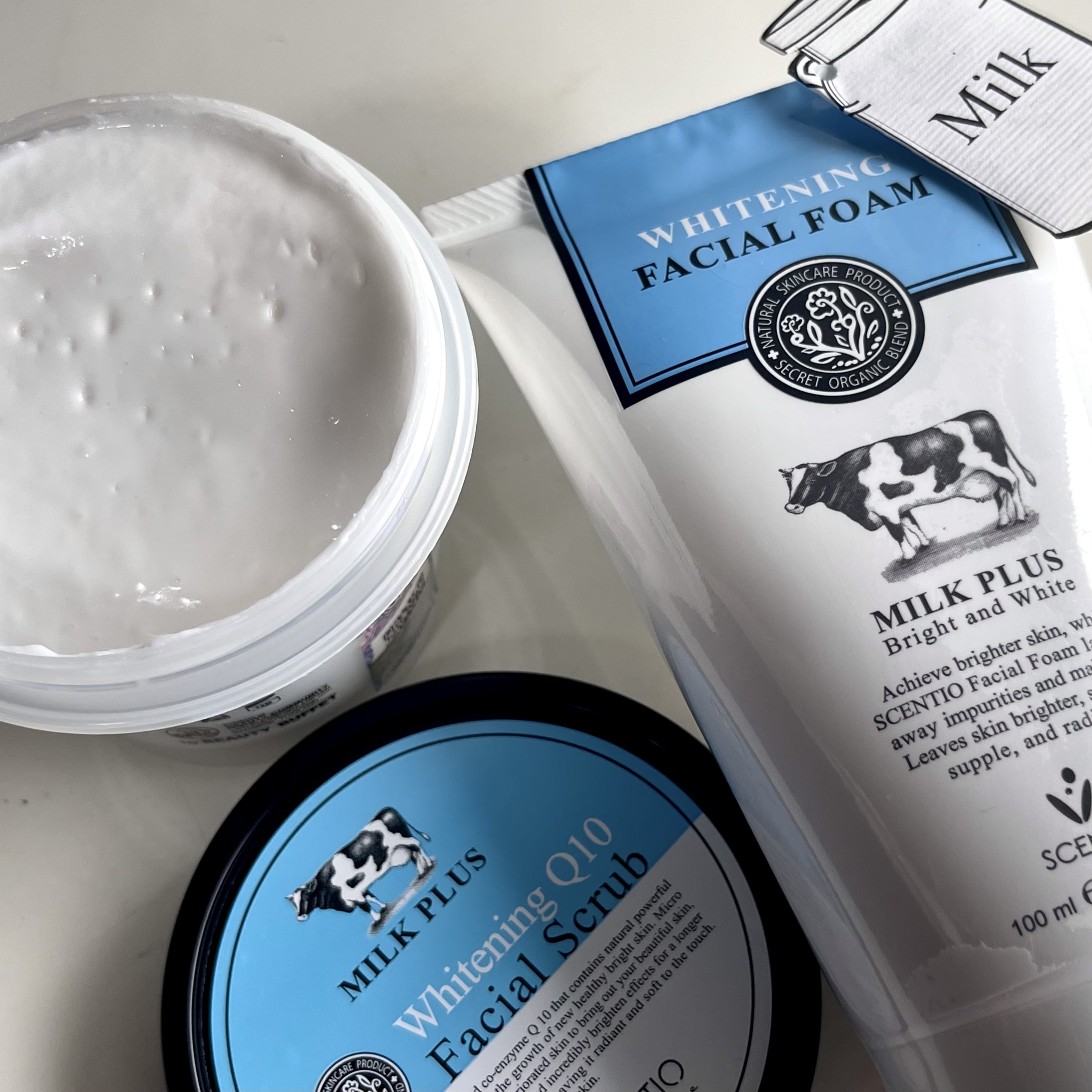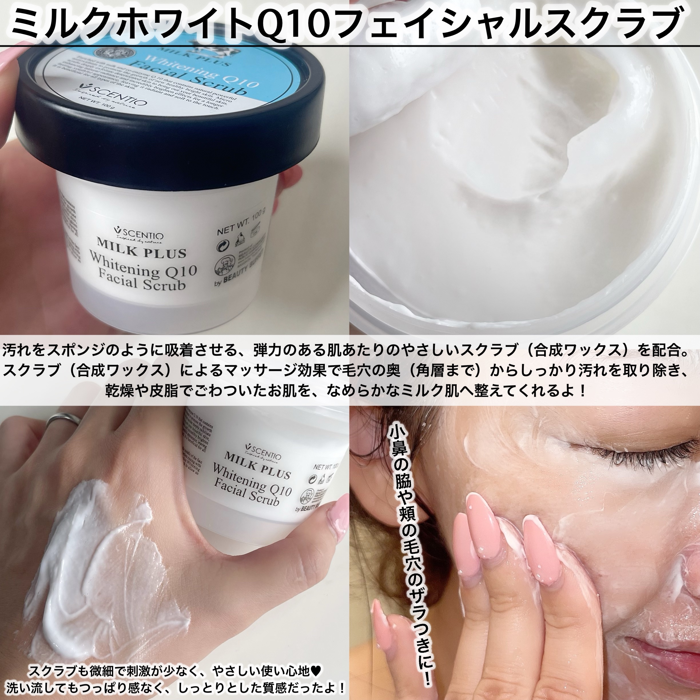 ミルクホワイトQ10フェイシャルスクラブ ミルクホワイトブライトニング・フェイシャルフォーム 優しい粒の小さめスクラブでした♪ 香りが甘くすごく癒されます✨ お肌が柔らかくなる感じがしました♪ 出した時は少し硬めのテクスチャーですが 泡立てるとふわふわで柔らかくなります♪ 柔らかい肌触り摩擦を感じにくく洗えました❤️ 私は朝洗顔としてもよく使用してます🫧 ミルクプロテイン(加水分解乳タンパク)配合のアイテムになります🤍