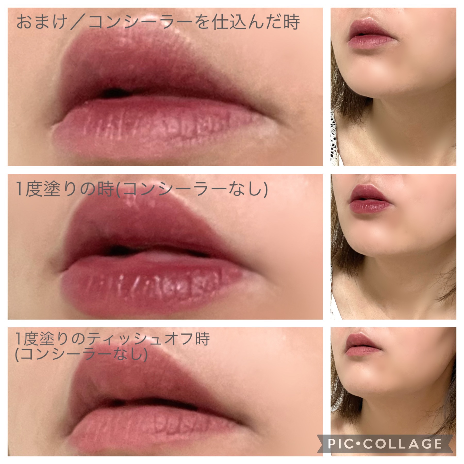 マットなのにかさつかない ふんわり柔らか軽いベルベットティントリップ 発色も良く唇に密着するテクスチャ 指でトントンしても馴染ませやすくて、 2食使いのグラデもテクニック要らず マットタイプ 塗りたては縦じわが目立たない 塗布後は、しっとりしていて、ベタつきはあまり気にならず保湿されている印象 飲食を含み、私は約7時間くらい持つ印象 特に下地やリップを塗らなくても終日乾燥は気にならなかった ・秋冬にぴったりな色 肌がキレイ見える色味が多い気がする ・グラデがしやすい 2色使いでグラデが簡単に出来た ・ブルベ得意カラーのうち濃い色は経時変化が楽しみ ブルベ得意カラーのうち濃い色は、時間が経つと 色味がピンク色っぽくなくって楽しい! ・色ムラと縦じわ 時間が経つと、色が濃いから仕方ないんだけど、色ムラが気になるった。あと縦じわも目立ったので、縦じわの対策はした方がキレイが長持ちすると思います