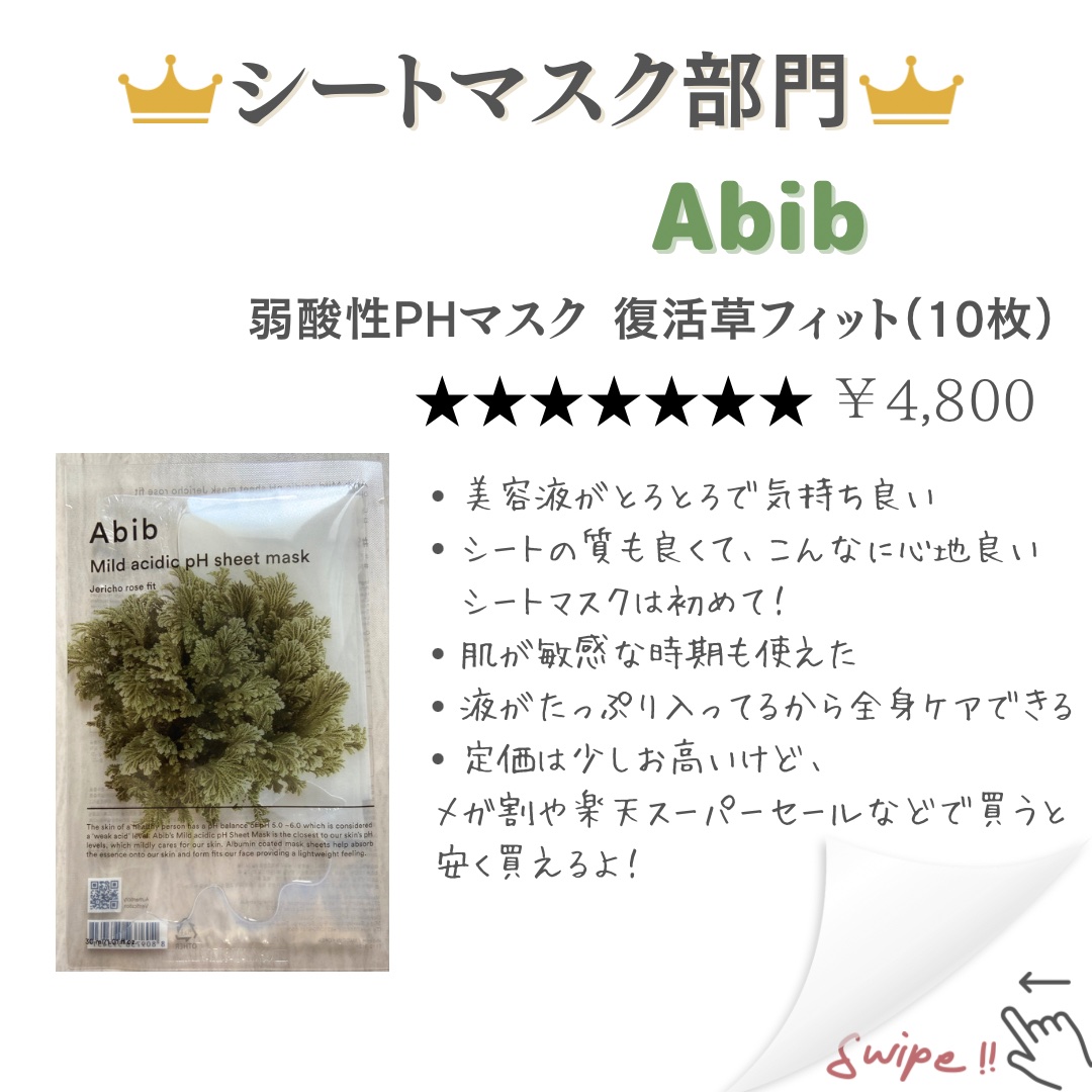 Abib弱酸性PHシートマスク復活草フィット初めて使ったパック保湿系のパックで使い心地が良かった肌荒れしている肌に使っても刺激がなく使えた1枚は高いけど特に乾燥が気になるときに特別ケアとして使っています。このパックは、シリーズがたくさんある...