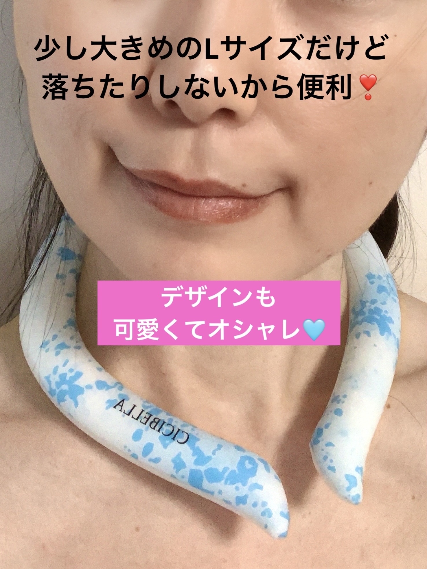 これ本当に不思議なんですけど28度以下の環境に置くだけで自然に凍結するんですよ。 水滴も出ないのでとっても快適に使えます。キンキンに冷たいんじゃなくて適度にひんやり〜って優しい冷たさ。 LサイズとMサイズの2種類。家族で共有出来るようにLサイズにしてみたけどやっぱりちょっと大きかったかな。ぴったり着けたい女性はMサイズの方がいいかと思います。 デザインが豊富にあるのでお気に入りの柄を見つけるのも楽しいですね。私はオリジナルデザインを選びました。