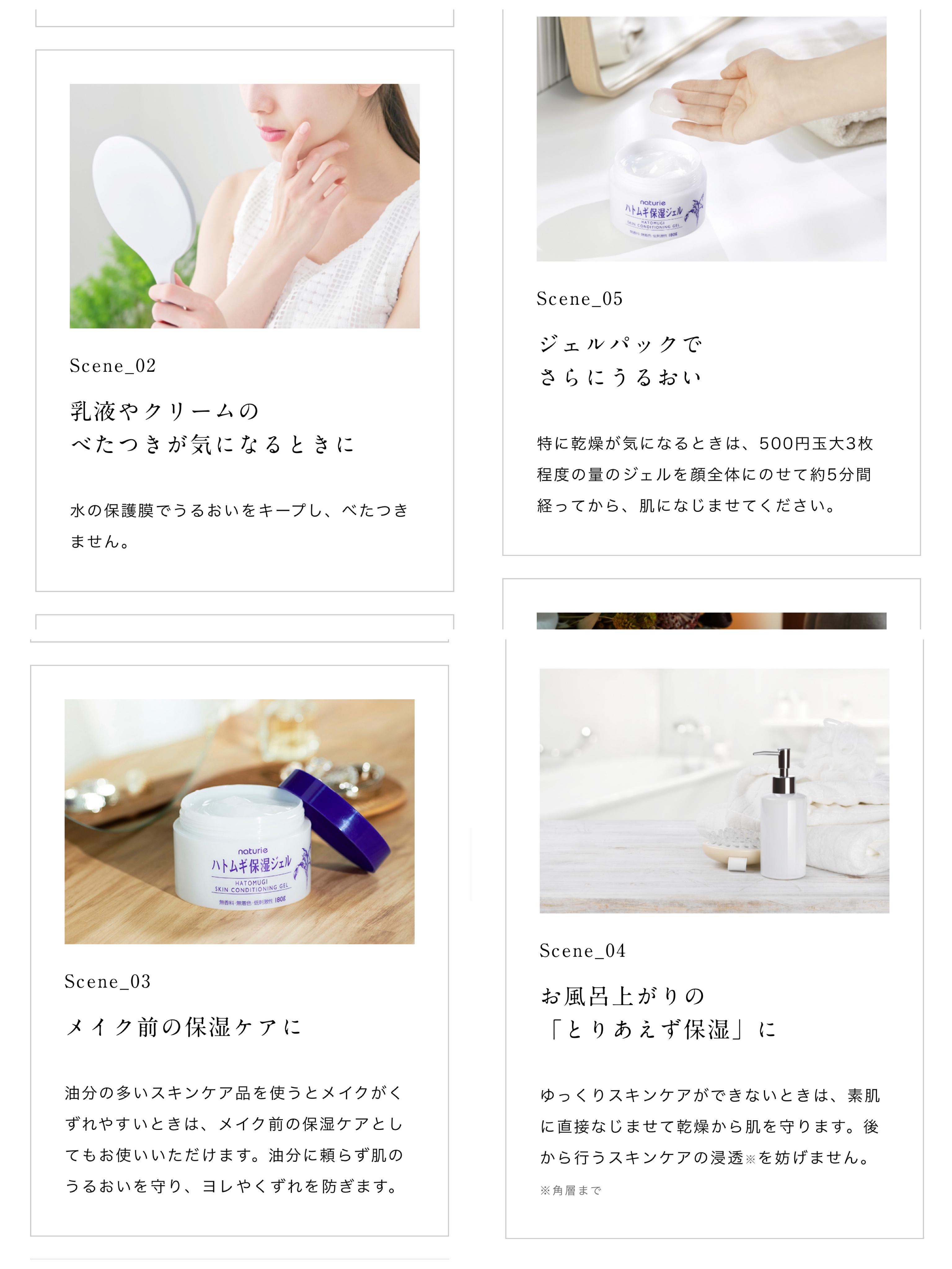 - 肌にうるおいを与えてスキンコンディションを整える、 天然保湿成分ハトムギエキス配合の保湿ジェルです。 ジェルを肌にのせると液状に変化して、肌表面に「水の保護膜」を形成。 継続的に角質層に水分を送りこむので、うるおいに満ちた肌が続きます。 油分を抑えたみずみずしい使用感でべたつきが気になりません。 基本は化粧水の後にたっぷり使ってください。 メイク前の保湿やお風呂上がりの「とりあえず保湿」、ボディにも。 ●使用方法 ■基本は、化粧水の後に美容液として 化粧水の後にたっぷり使ってください。 500円玉大の量を2回重ねづけするのが目安です。 その後、お好みで乳液やクリームを重ねてください。 ■乳液やクリームのべたつきが気になるときに 水の保護膜でうるおいをキープし、べたつきません。 ■メイク前の保湿ケアに 油分の多いスキンケア品を使うとメイクがくずれやすいときは、 メイク前の保湿ケアとしてもお使いいただけます。 油分に頼らず肌のうるおいを守り、ヨレやくずれを防ぎます。 ■お風呂上がりの「とりあえず保湿」に ゆっくりスキンケアができないときは、 素肌に直接なじませて乾燥から肌を守ります。 油分が少ないので、後から行うスキンケアの浸透(※)を妨げません。 ※角質層まで ■ジェルパックでさらにうるおい 特に乾燥が気になるときは、 500円玉大3枚程度の量を顔全体にのせて 約5分間経ってから、肌になじませてください。 ■おやすみ前の「重ねづけ保湿」に 500円玉大の量のジェルをもう一度なじませることで、 睡眠中の乾燥を防ぎます。 ■ボディにも べたつかないので、毎日の入浴後や日差しを浴びた後などの ボディのスキンケアにもおすすめです。