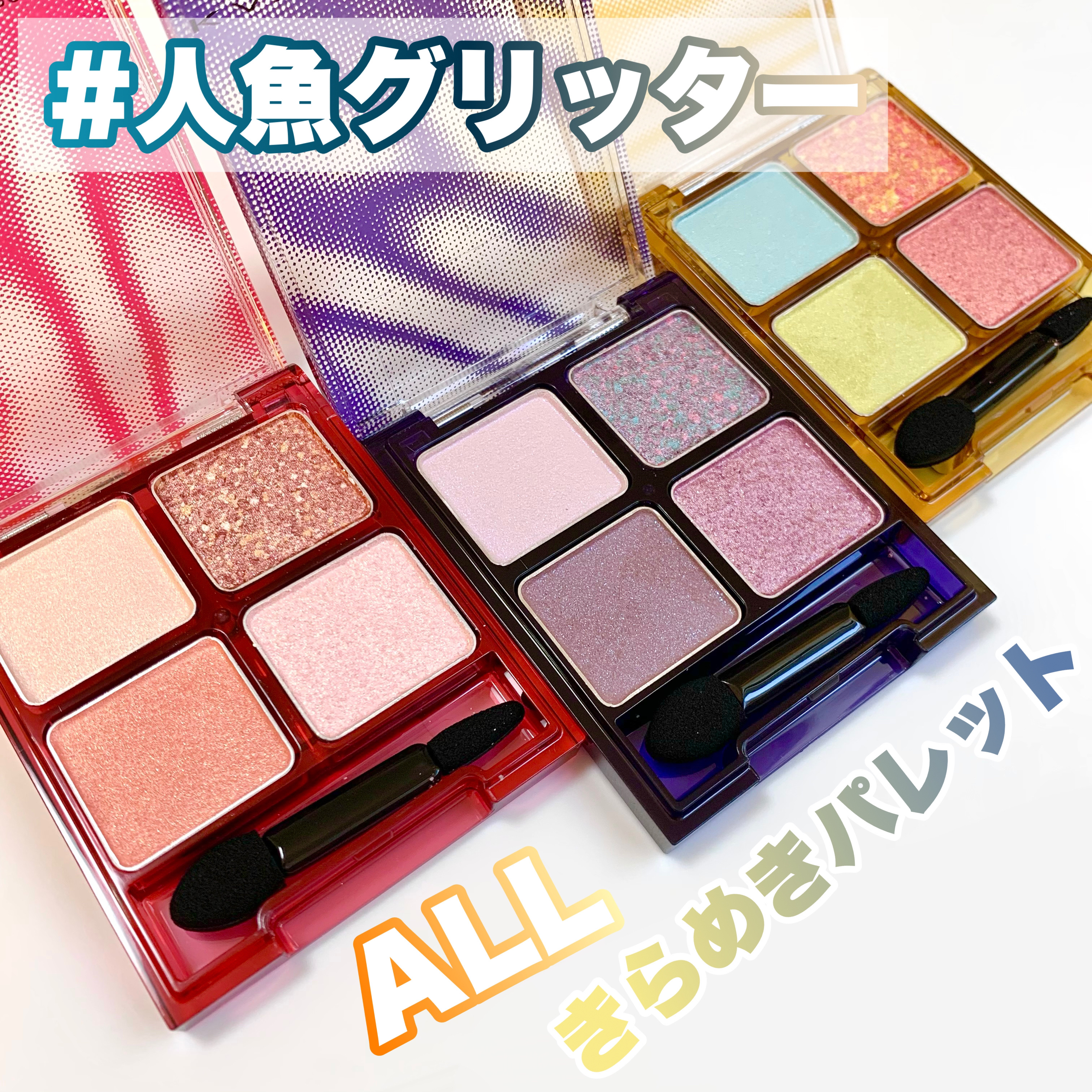 - 【数量限定発売】 きらめく水面のような輝きで目元の存在感を高めるオールきらめきパレットアイシャドウ ◆異なる輝きの組み合わせ A:ツヤと透明感小粒のパール質感 B:しっとりとした発色の繊細パール質感のクリーミータッチ C:存在感のある大粒ハイパーグリッター質感 D:3種の異なる色と輝きで揺らめくミックスグリッター質感 ◆全3種 ■パレット右側2色に採用「ハイパーグリッター処方」 ✓密着力が高い!:密着性の高いオイルを配合。パールが落ちにくい。 ✓見た目の輝度が高い!:油剤を多く、パールを高配合*することで、強い光沢感・グリッター質感を演出。 *自社従来のパール処方と比較して。