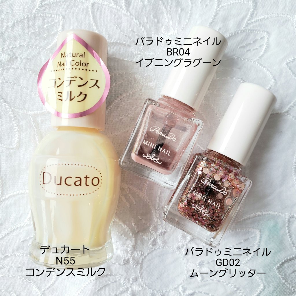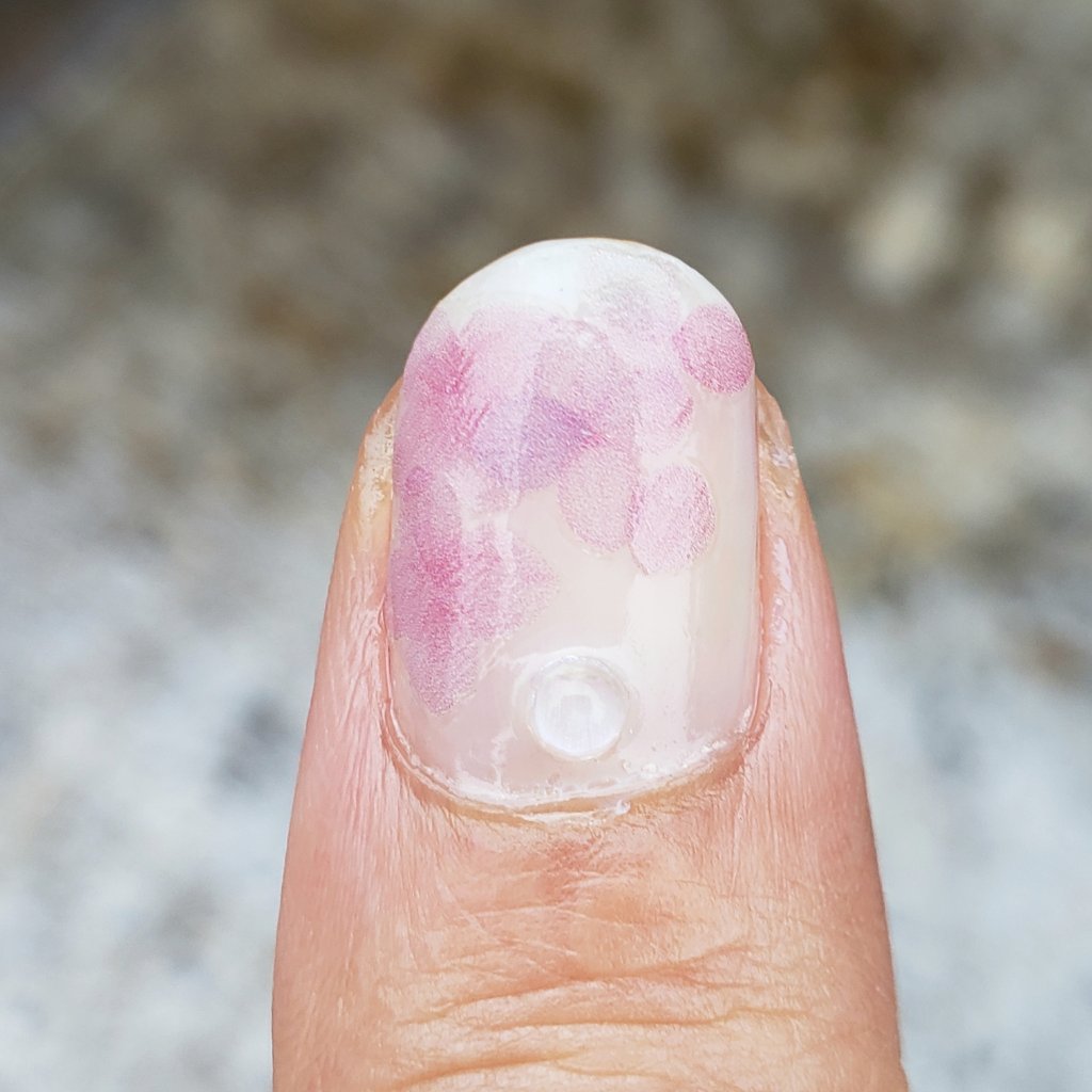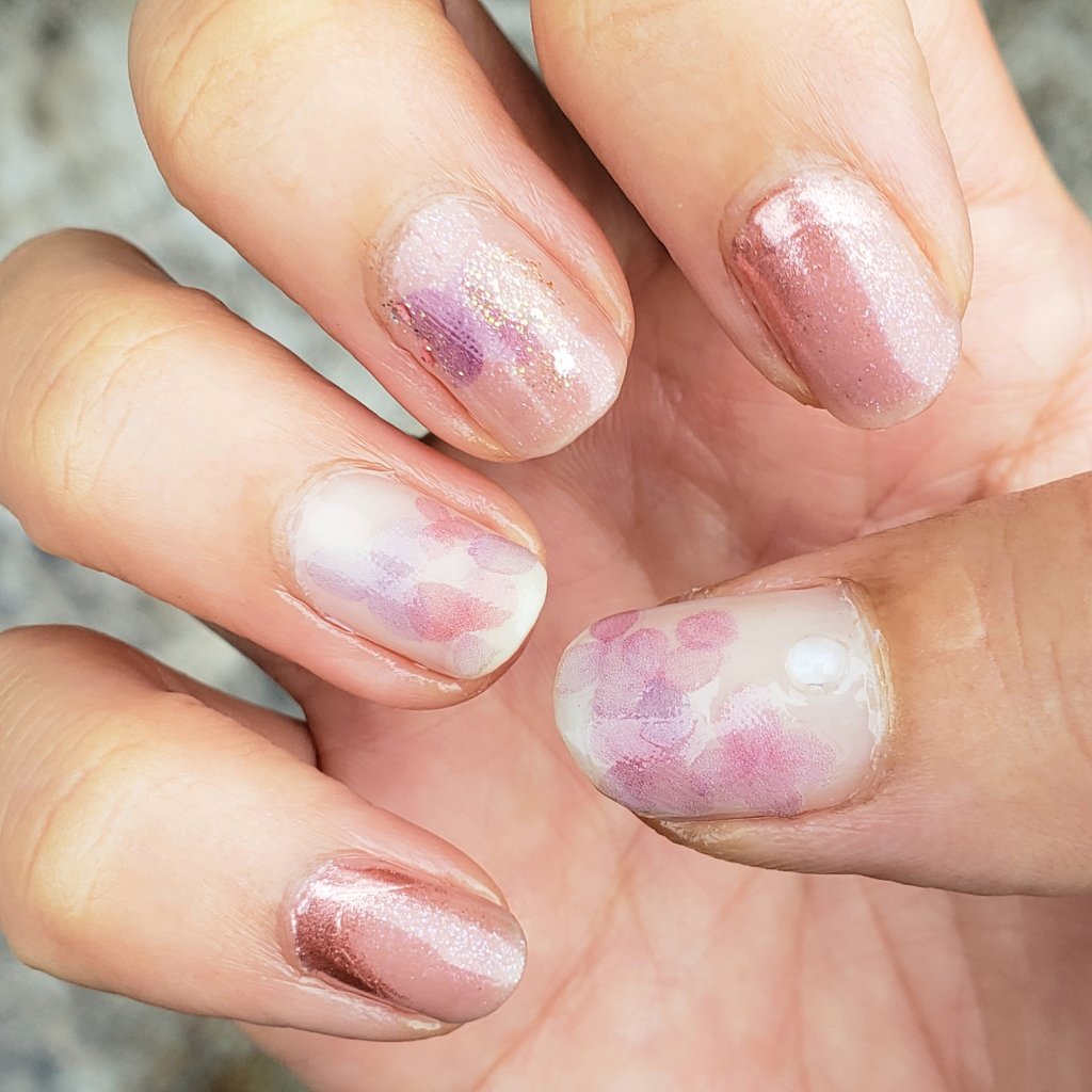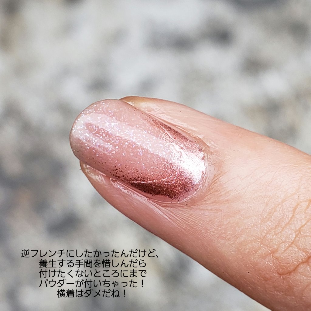 ポイントとしては、ガラスフレンチ部分は一息でやること…かな。 手順でいうと②~④だね。ベースにしたローズミルクティーが乾いたら、フレンチラインをひくところからメタルホロを貼り付けるところまでサッサッサッと💨 下準備として、メタルホロはちょうどいい大きさに切っておくと作業がスムーズ◎ それから、メタルホロを使うときは下にティッシュかキッチンペーパーを敷いておくと片付けもラク◎ 指一本ずつの作業だから、ネイルにかかる時間がかなり長くなるけど、やっぱりガラスフレンチは可愛い🖤