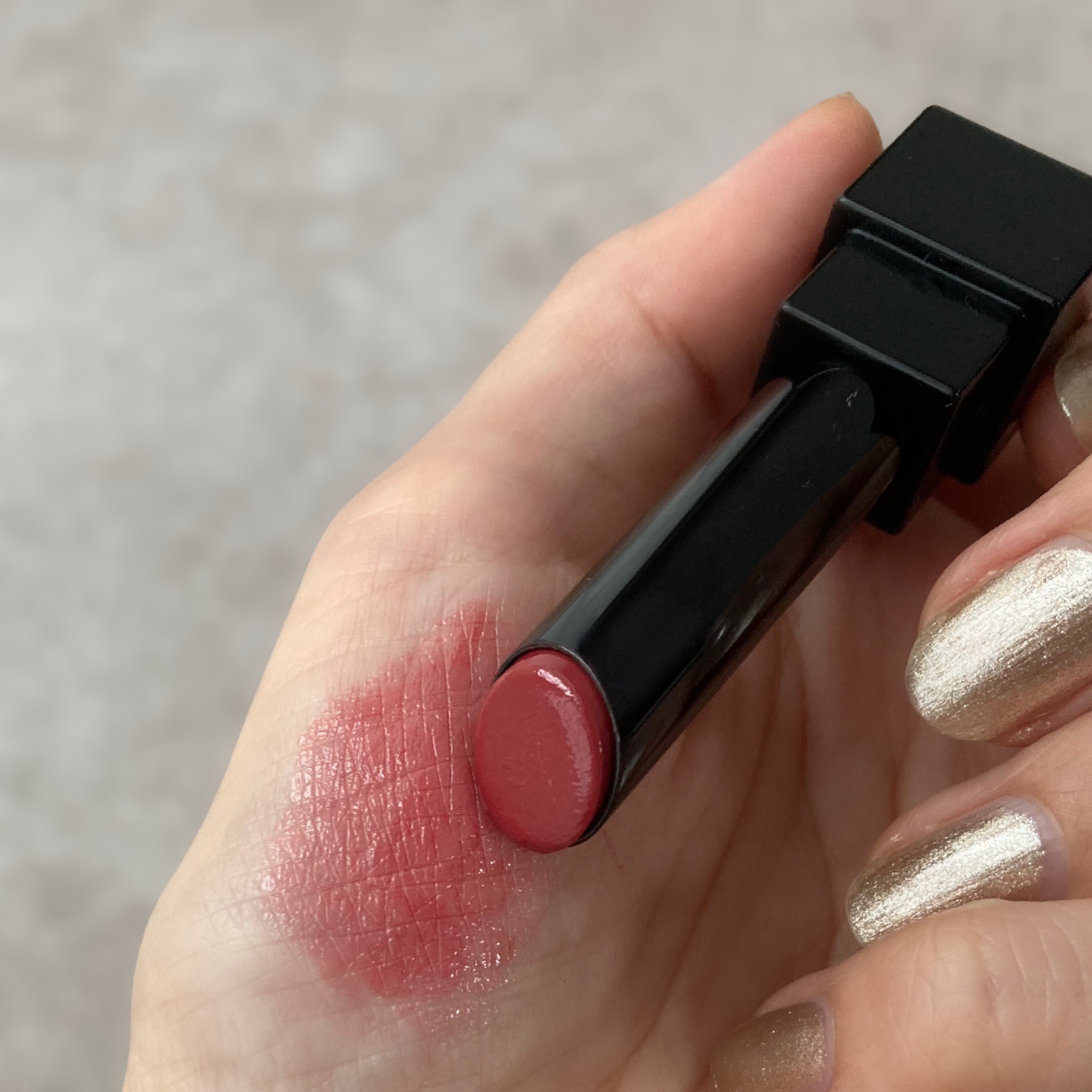 ワックスとオイル、バウンシングパウダーをバランス良く配合した処方が特徴で、カスタードのように軽やかに広がって肌に溶け込むようになじみます。 水や汗に強いウォータープルーフタイプなのでよれにくく、色持ちがよいのもポイント◎ ベビーピンク、ビターブラウン、ラベンダーやピュアレッドなど雰囲気の異なるカラバリが揃っているので、きっとお気に入りの1色が見つかるはず! わずかにピンクみのあるウォームベージュで、一見して使いやすそうですよね。 タッチアップしてみるとじんわりした血色カラーが可愛くて即決でした。 特にリップに使うと理想のメタリックベージュになるのがお気に入りです🫶
