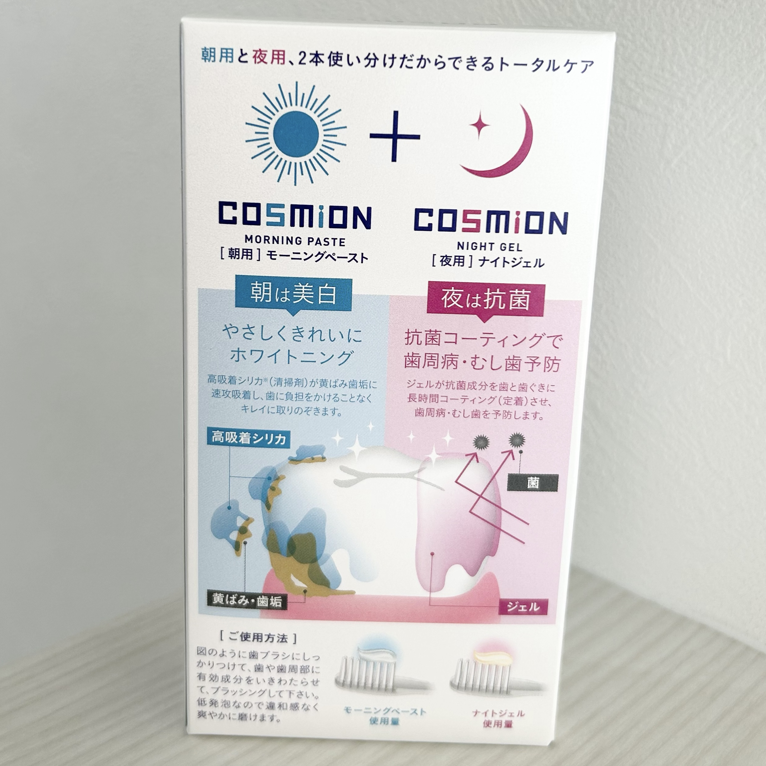 - COSMiONは ・汚れが付きやすい「朝」 ・菌が増えやすい「夜」 それぞれに適した歯磨剤を使い分けることで、口内環境を清潔に整えるオーラルケアブランドです。ライフサイクルに添ったオーラルケアを行うことで、健やかで美しい歯をサポートします。