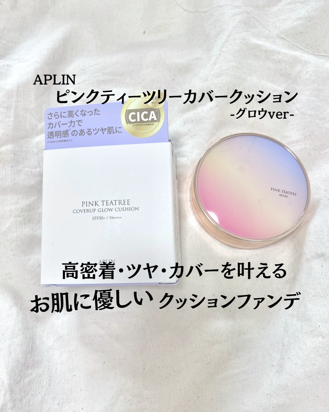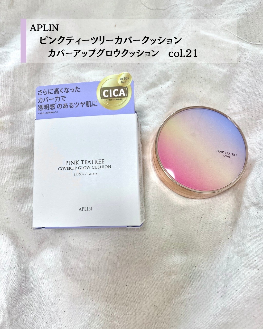 APLIN ピンクティーツリーカバークッション 21号ライトベージュ 2,490円(税込) 少量でよく伸びてハイカバー! 赤みやくすみをしっかりカバ一できるのに、厚塗り感のないなめらかな仕上がり♡ ハイカバーなのにナチュラルなツヤ感とサラッとしつつ、乾燥崩れしにくい仕上がりに感動します!!