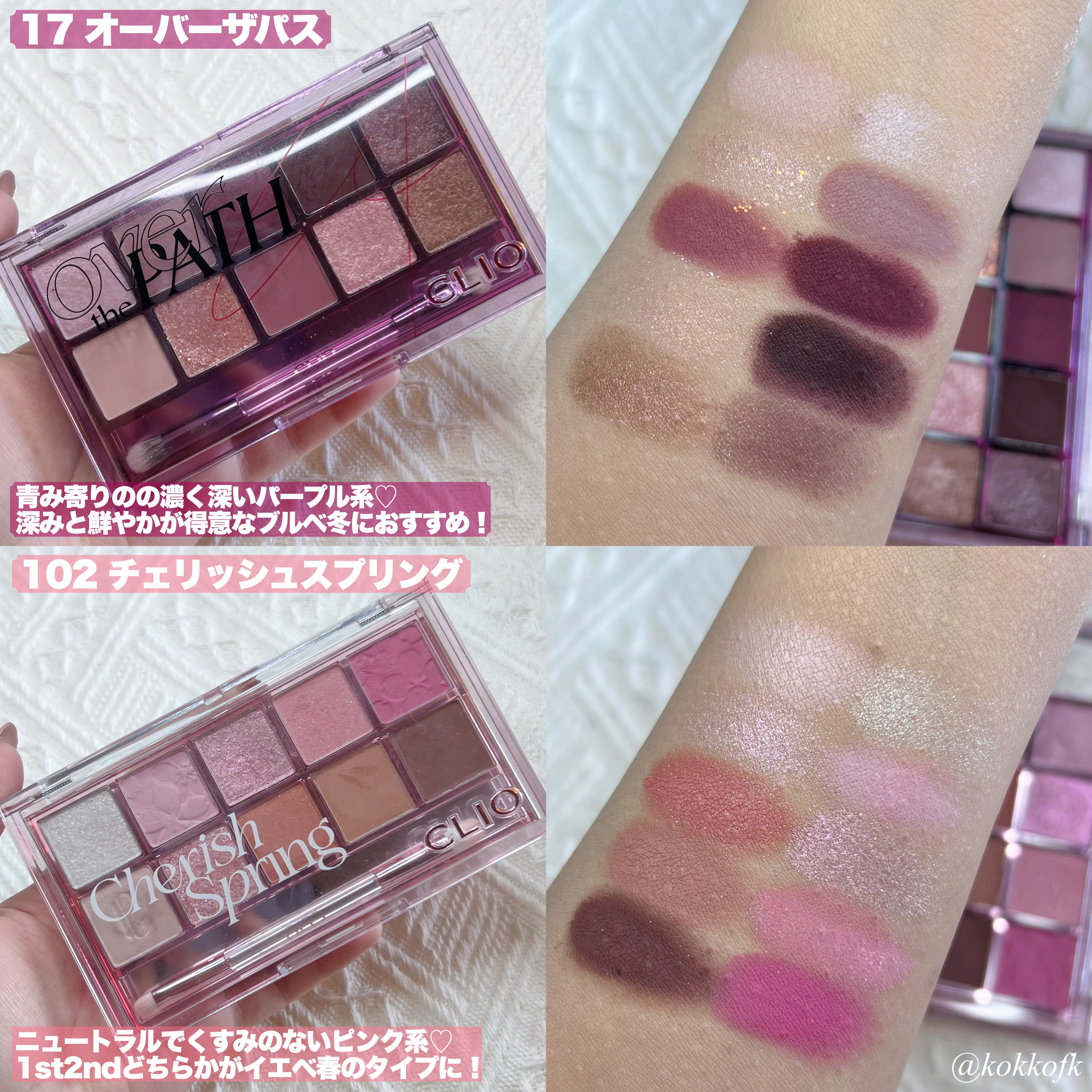 rom&nd────────────ベターザンパレット06 PEONY NUDE GARDEN (¥2900) rom&nd────────────ベターザンアイズ W03 Dry Strawberry (¥1569) HOLIKA HOLIKA────────────マイフェブムードアイパレットMOONY (¥2050) HOLIKA HOLIKA────────────マイフェブムードアイパレットPINK OLOGY (¥2050) CLIO────────────プロ アイ パレット13 PICNIC BY THE SUNSET (¥2390) PERIPERA────────────オール テイク ムード パレット04 MUTEFUL ROSE (¥1590) PERIPERA────────────オール テイク ムード パレット09 MOONLIKE LAVENDER PINK (¥1590) PERIPERA────────────インク ポケット シャドウ パレット05 TOUCHING TARO STARS (¥1190)