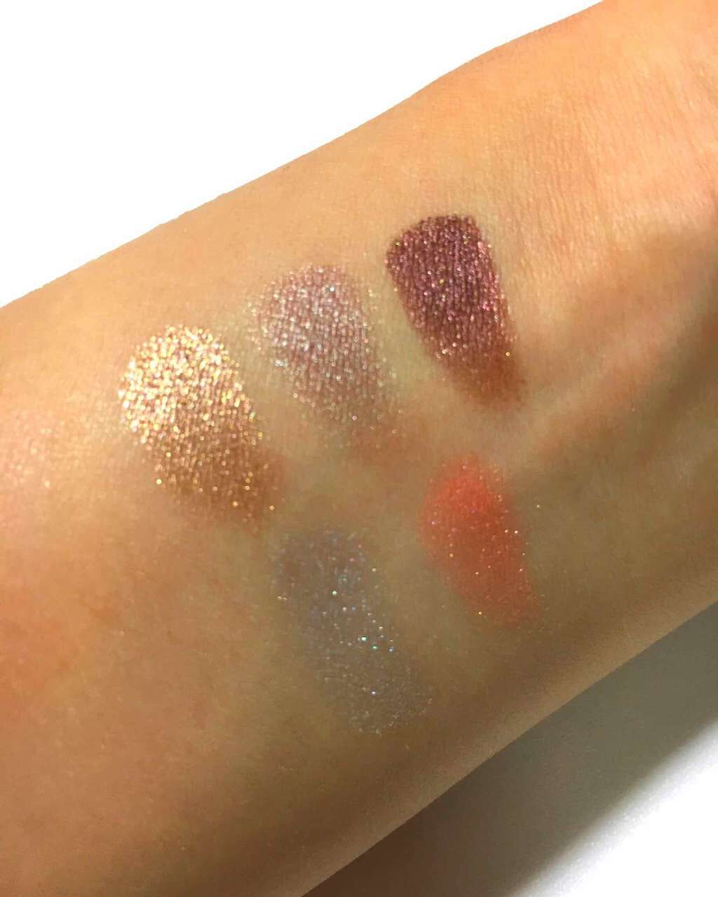 商品名«ハイライターブラッシングハートハートハイライターユニコーンハート»とてもラメ感が強くて発色もとてもいいです✨一つ一つのカラーをとってアイシャドウとしても使えます👏💓全ての色を筆でとってハイライトとして使えすが、筆につきすぎるので少し粉...