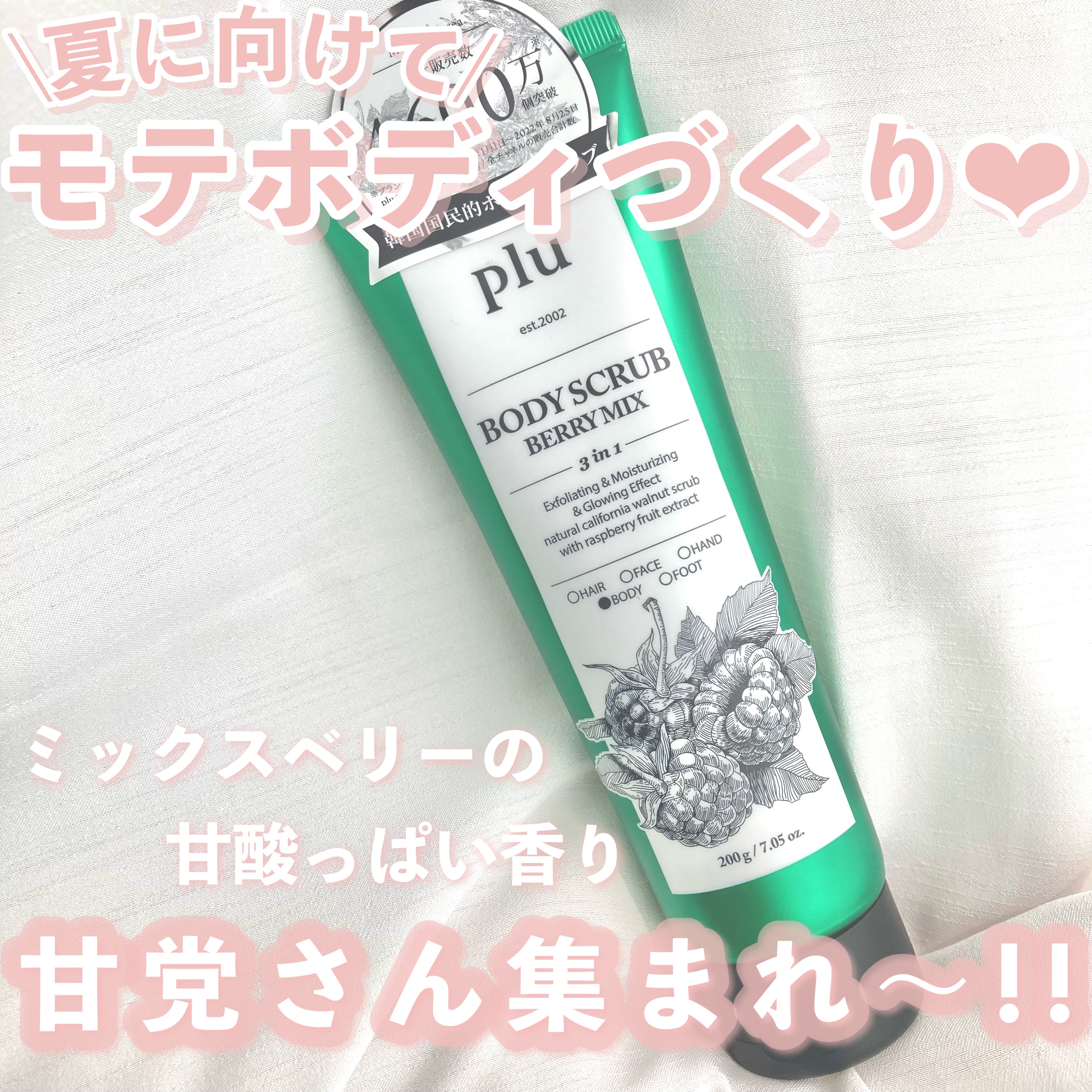 - plu ボディスクラブは韓国累積販売4600万個以上、クルミ穀粒配合のスクラブ。 甘酸っぱいベリーミックスの香り。