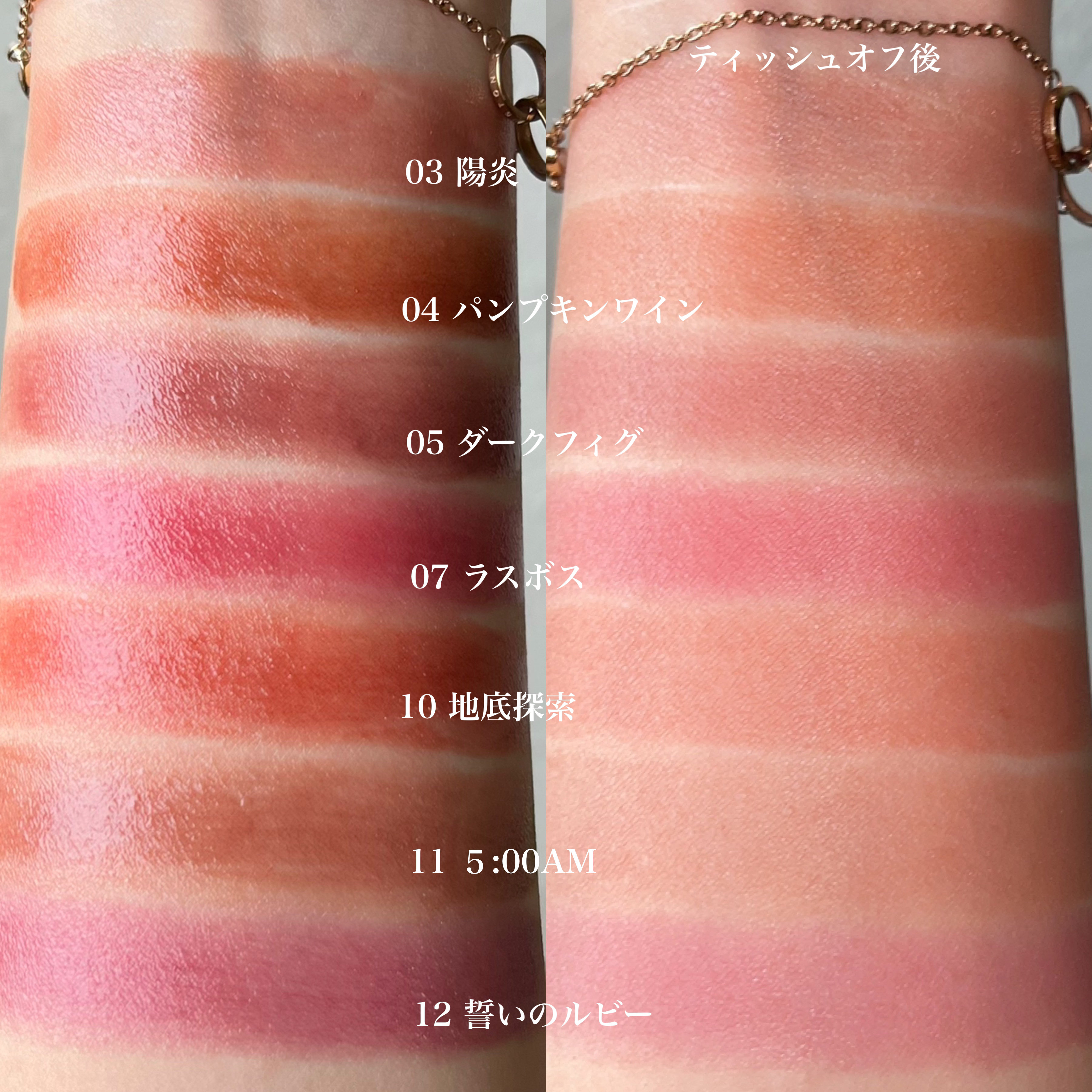 - <01 欲望の塊> テトライソステアリン酸ジペンタエリスリチル、トリ(カプリル酸/カプリン酸)グリセリル、オクチルドデカノール、ラウロイルグルタミン酸ジ(フィトステリル/オクチルドデシル)、ビスアルキル(C16-18)グリセリルウンデシルジメチコン、イソノナン酸イソトリデシル、水添ポリイソブテン、ラウロイルグルタミン酸ジ(オクチルドデシル/フィトステリル/ベヘニル)、パラフィン、合成ワックス、ダイマージリノール酸(フィトステリル/イソステアリル/セチル/ステアリル/ベヘニル)、マイクロクリスタリンワックス、水添マイクロクリスタリンワックス、ヒドロキシステアリン酸エチルヘキシル、トコフェロール、ホホバ種子油、オリーブ果実油、アーモンド油、(エチレン/プロピレン)コポリマー、ポリエチレン、ジメチコン、(+/-)(チタン/酸化チタン)焼結物、マイカ、ラウロイルアスパラギン酸Na、ラウロイルリシン、塩化亜鉛、酸化チタン、酸化鉄、水酸化Al、硫酸Ba、トリイソステアリン酸イソプロピルチタン、酸化スズ、ホウケイ酸(Ca/Al)、合成フルオロフロゴパイト、黄4、黄5、赤104(1)、赤201、赤202 <02 ピンクバナナ> テトライソステアリン酸ジペンタエリスリチル、トリ(カプリル酸/カプリン酸)グリセリル、オクチルドデカノール、ラウロイルグルタミン酸ジ(フィトステリル/オクチルドデシル)、ビスアルキル(C16-18)グリセリルウンデシルジメチコン、イソノナン酸イソトリデシル、水添ポリイソブテン、ラウロイルグルタミン酸ジ(オクチルドデシル/フィトステリル/ベヘニル)、パラフィン、合成ワックス、ダイマージリノール酸(フィトステリル/イソステアリル/セチル/ステアリル/ベヘニル)、マイクロクリスタリンワックス、水添マイクロクリスタリンワックス、ヒドロキシステアリン酸エチルヘキシル、トコフェロール、ホホバ種子油、オリーブ果実油、アーモンド油、(エチレン/プロピレン)コポリマー、ポリエチレン、ジメチコン、(+/-)(チタン/酸化チタン)焼結物、マイカ、ラウロイルアスパラギン酸Na、ラウロイルリシン、塩化亜鉛、酸化チタン、酸化鉄、水酸化Al、硫酸Ba、トリイソステアリン酸イソプロピルチタン、酸化スズ、ホウケイ酸(Ca/Al)、合成フルオロフロゴパイト、黄4、黄5、赤104(1)、赤201、赤202 <03 陽炎> テトライソステアリン酸ジペンタエリスリチル、トリ(カプリル酸/カプリン酸)グリセリル、オクチルドデカノール、ラウロイルグルタミン酸ジ(フィトステリル/オクチルドデシル)、ビスアルキル(C16-18)グリセリルウンデシルジメチコン、イソノナン酸イソトリデシル、水添ポリイソブテン、ラウロイルグルタミン酸ジ(オクチルドデシル/フィトステリル/ベヘニル)、パラフィン、合成ワックス、ダイマージリノール酸(フィトステリル/イソステアリル/セチル/ステアリル/ベヘニル)、マイクロクリスタリンワックス、水添マイクロクリスタリンワックス、ヒドロキシステアリン酸エチルヘキシル、トコフェロール、ホホバ種子油、オリーブ果実油、アーモンド油、(エチレン/プロピレン)コポリマー、ポリエチレン、ジメチコン、(+/-)(チタン/酸化チタン)焼結物、マイカ、ラウロイルアスパラギン酸Na、ラウロイルリシン、塩化亜鉛、酸化チタン、酸化鉄、水酸化Al、硫酸Ba、トリイソステアリン酸イソプロピルチタン、酸化スズ、ホウケイ酸(Ca/Al)、合成フルオロフロゴパイト、黄4、黄5、赤104(1)、赤201、赤202 <04 パンプキンワイン> テトライソステアリン酸ジペンタエリスリチル、トリ(カプリル酸/カプリン酸)グリセリル、オクチルドデカノール、ラウロイルグルタミン酸ジ(フィトステリル/オクチルドデシル)、ビスアルキル(C16-18)グリセリルウンデシルジメチコン、イソノナン酸イソトリデシル、水添ポリイソブテン、ラウロイルグルタミン酸ジ(オクチルドデシル/フィトステリル/ベヘニル)、パラフィン、合成ワックス、ダイマージリノール酸(フィトステリル/イソステアリル/セチル/ステアリル/ベヘニル)、マイクロクリスタリンワックス、水添マイクロクリスタリンワックス、ヒドロキシステアリン酸エチルヘキシル、トコフェロール、ホホバ種子油、オリーブ果実油、アーモンド油、(エチレン/プロピレン)コポリマー、ポリエチレン、ジメチコン、(+/-)(チタン/酸化チタン)焼結物、マイカ、ラウロイルアスパラギン酸Na、ラウロイルリシン、塩化亜鉛、酸化チタン、酸化鉄、水酸化Al、硫酸Ba、トリイソステアリン酸イソプロピルチタン、酸化スズ、ホウケイ酸(Ca/Al)、合成フルオロフロゴパイト、黄4、黄5、赤104(1)、赤201、赤202 <05 ダークフィグ> テトライソステアリン酸ジペンタエリスリチル、トリ(カプリル酸/カプリン酸)グリセリル、オクチルドデカノール、ラウロイルグルタミン酸ジ(フィトステリル/オクチルドデシル)、ビスアルキル(C16-18)グリセリルウンデシルジメチコン、イソノナン酸イソトリデシル、水添ポリイソブテン、ラウロイルグルタミン酸ジ(オクチルドデシル/フィトステリル/ベヘニル)、