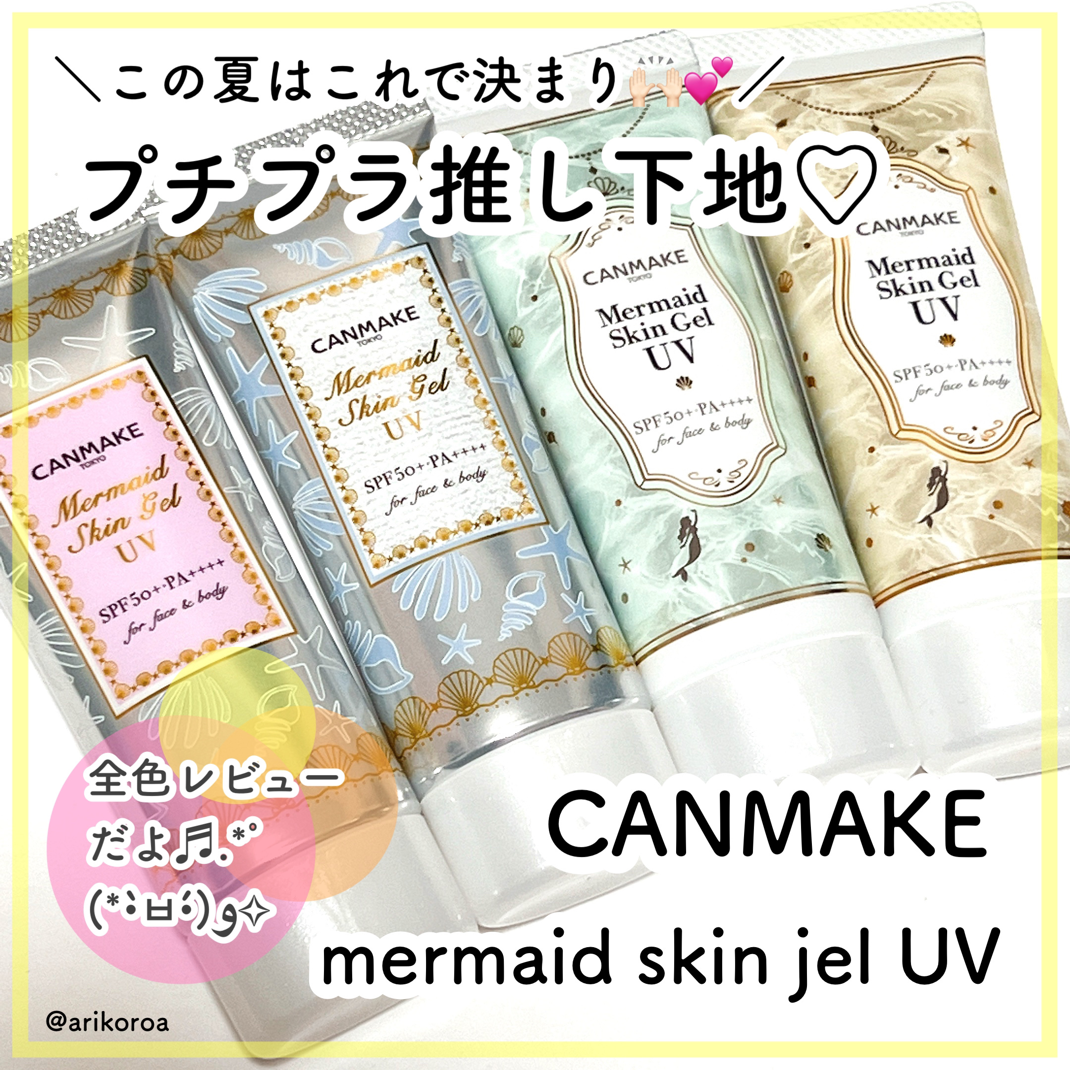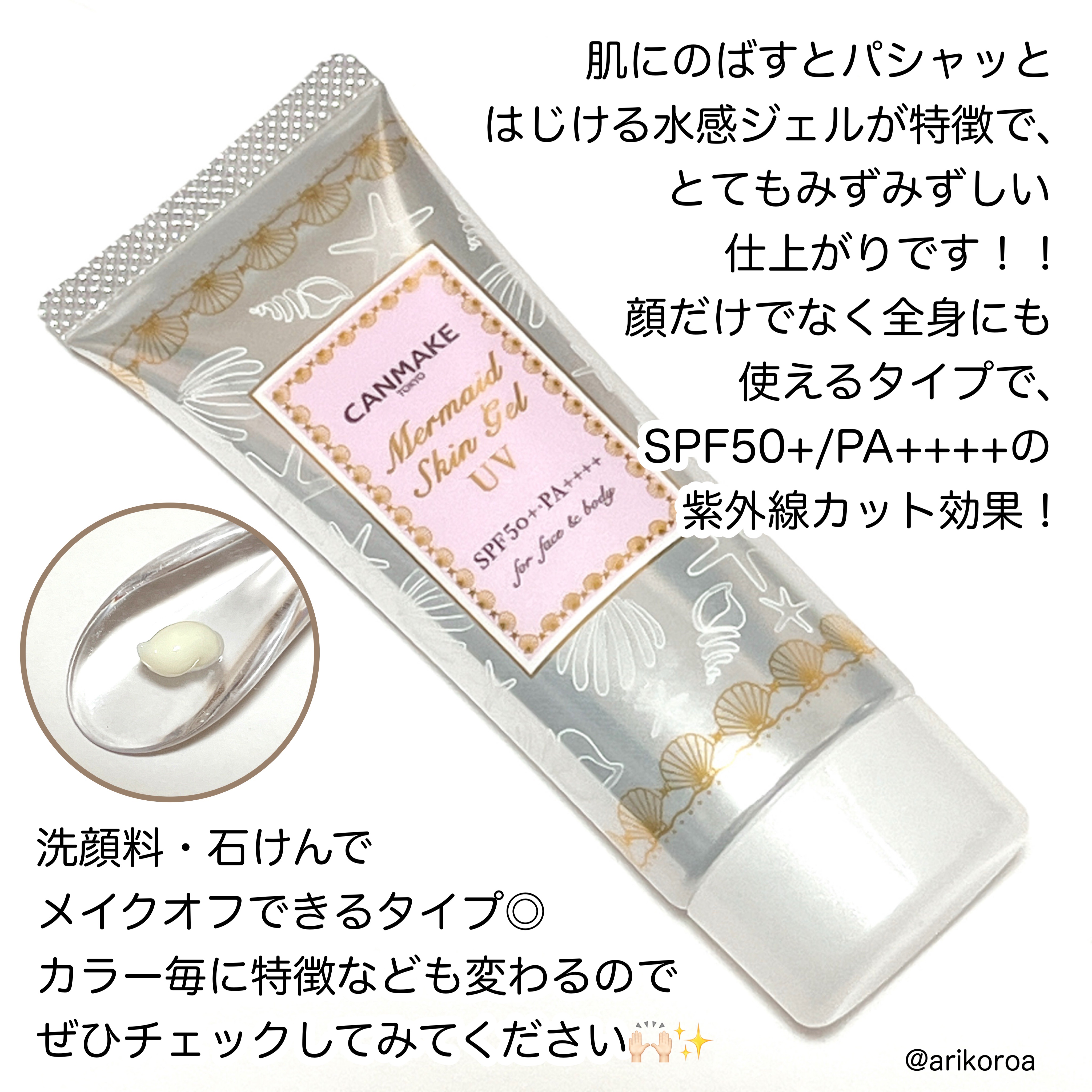 *キャンメイク*マーメイドスキンジェルUVSPF50+/PA++++40g¥77002ホワイト顔・体用の日焼け止めジェルです美容成分85%配合で化粧水感覚で使えるため、洗顔後にすぐ使えます洗顔料で落とせるタイプです安価ですが40gなので小さめ...