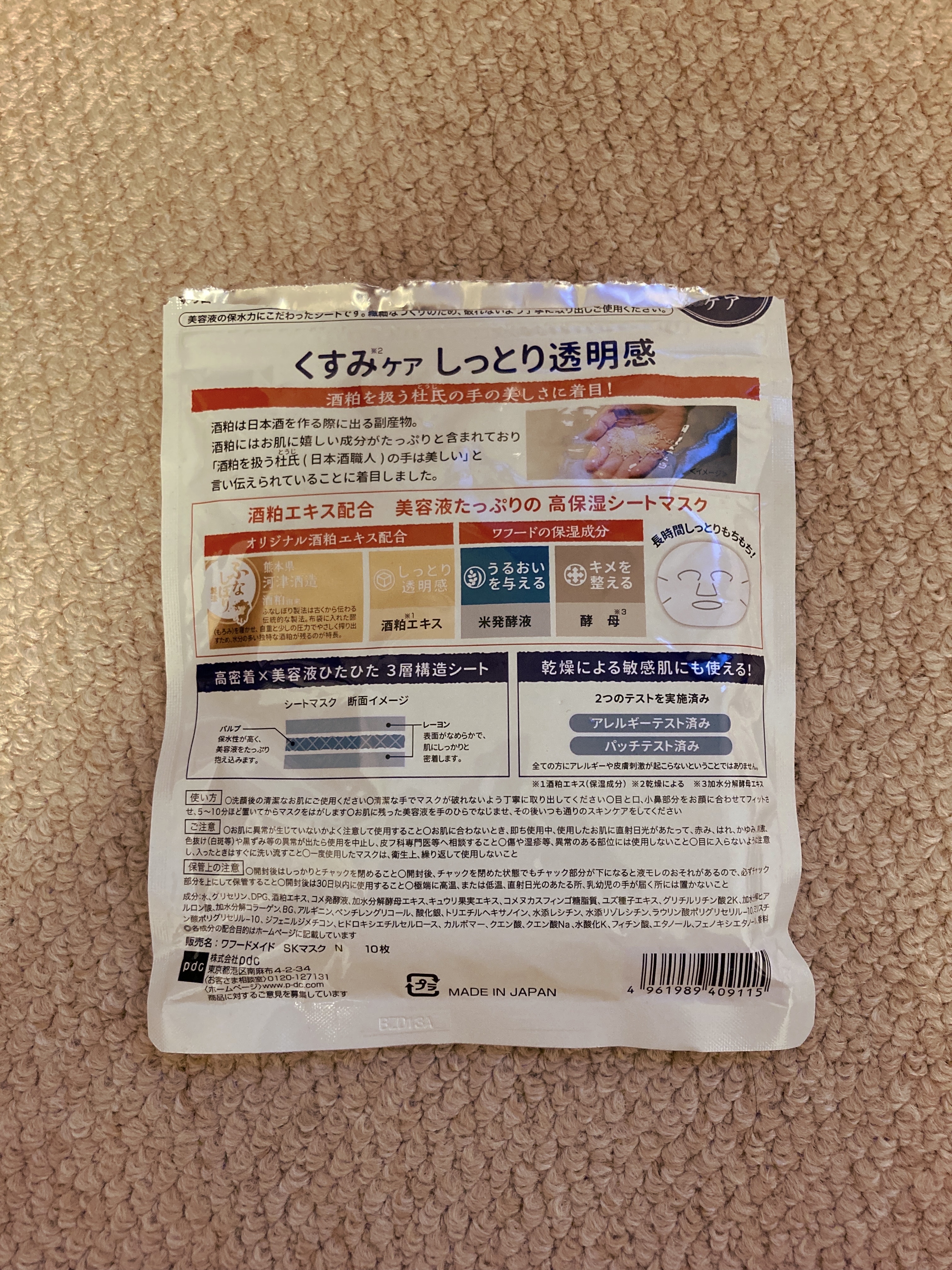 - <酒粕マスク> 水添レシチン、ジフェニルジメチコン、ユズ種子エキス、水添リゾレシチン、コメ発酵液、キュウリ果実エキス、フィチン酸、ラウリン酸ポリグリセリル-10、クエン酸Na、酸化銀、加水分解酵母エキス、ミリスチン酸ポリグリセリル-10、コメヌカスフィンゴ糖脂質、クエン酸、ヒドロキシエチルセルロース、加水分解コラーゲン、水、DPG、アルギニン、トリエチルヘキサノイン、グリチルリチン酸2K、エタノール、香料、フェノキシエタノール、水酸化K、カルボマー、加水分解ヒアルロン酸、酒粕エキス、グリセリン、BG、ペンチレングリコール <酒粕マスク【旧】> グリセリン、DPG、エタノール、酒粕エキス、コメ発酵液、加水分解酵母エキス、キュウリ果実エキス、コメヌカスフィンゴ糖脂質、ユズ種子エキス、BG、グリシン、酸化銀、トリエチルヘキサノイン、ラウリン酸ポリグリセリル‐10、ジフェニルジメチコン、ミリスチン酸ポリグリセリル‐10、水添レシチン、リゾレシチン、ヒドロキシエチルセルロース、カルボマー、クエン酸、クエン酸Na、水酸化K、水酸化Na、フィチン酸、フェノキシエタノール、香料