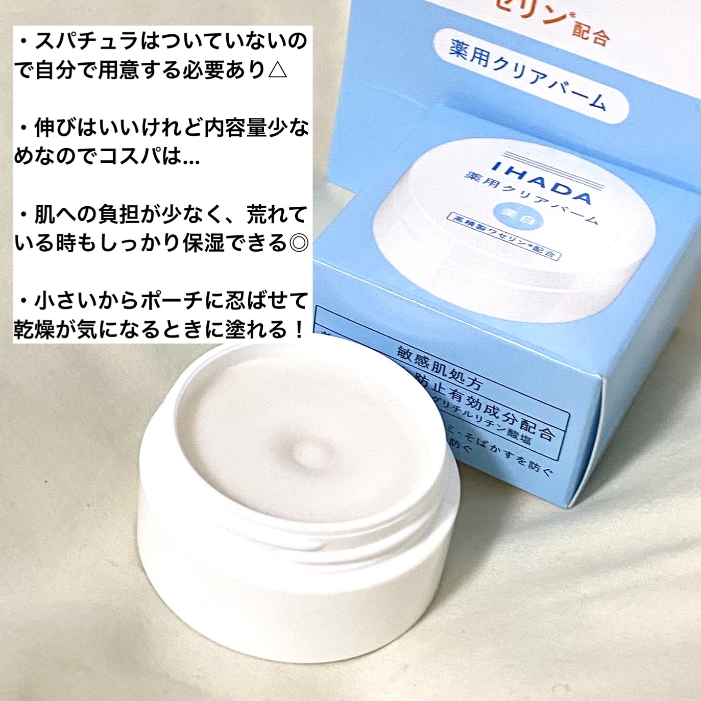 うるおい密閉してくれるIHADAの薬用バーム! とにかく低刺激で使いやすいです。 高精製ワセリン配合で乾燥などの外部刺激から守ってくれる 少量でとろけるように伸びてくれるバームでワセリン配合なのですが、べたつかずにしっかりと保湿してくれるのがお気に入りです!