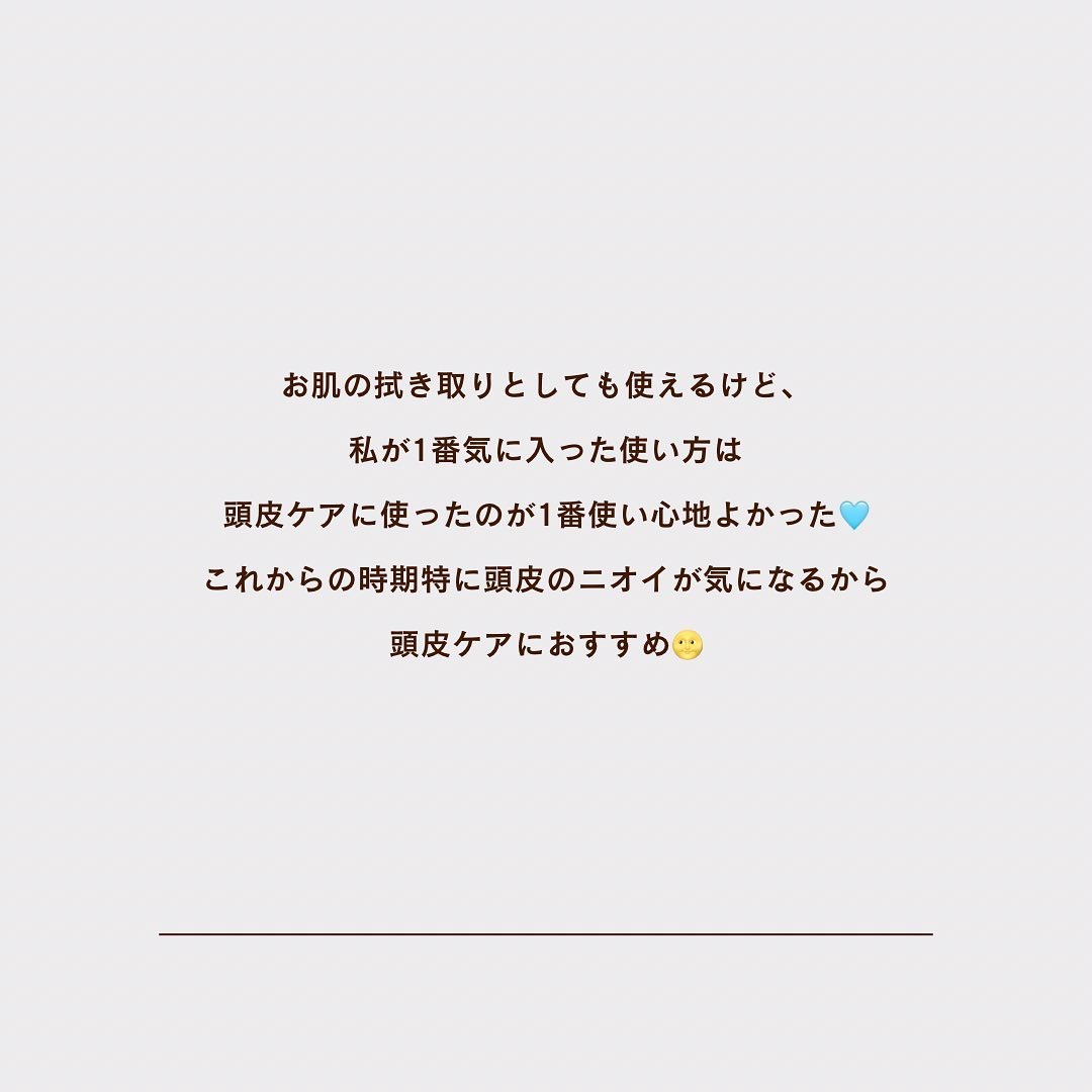 拭き取りで古い角質や毛穴に詰まった油分や汗をケア。 顔に使うときはコットンにとって、黒ずみが気になる部分をコットンパックするような感じで使います。 私は鼻とあごを10分ほどコットンパックして使いました。 つるつるになって、黒ずみが減ったような感じがしました◎ 頭皮に使う場合は、髪を濡らしたあと頭皮に直接なじませマッサージしたあとに、そのままシャンプーをします。 顔にも頭皮にもつかえる角質ケアってめずらしい! 角質や黒ずみが気になったとき、スペシャルケアとして使おうと思います。