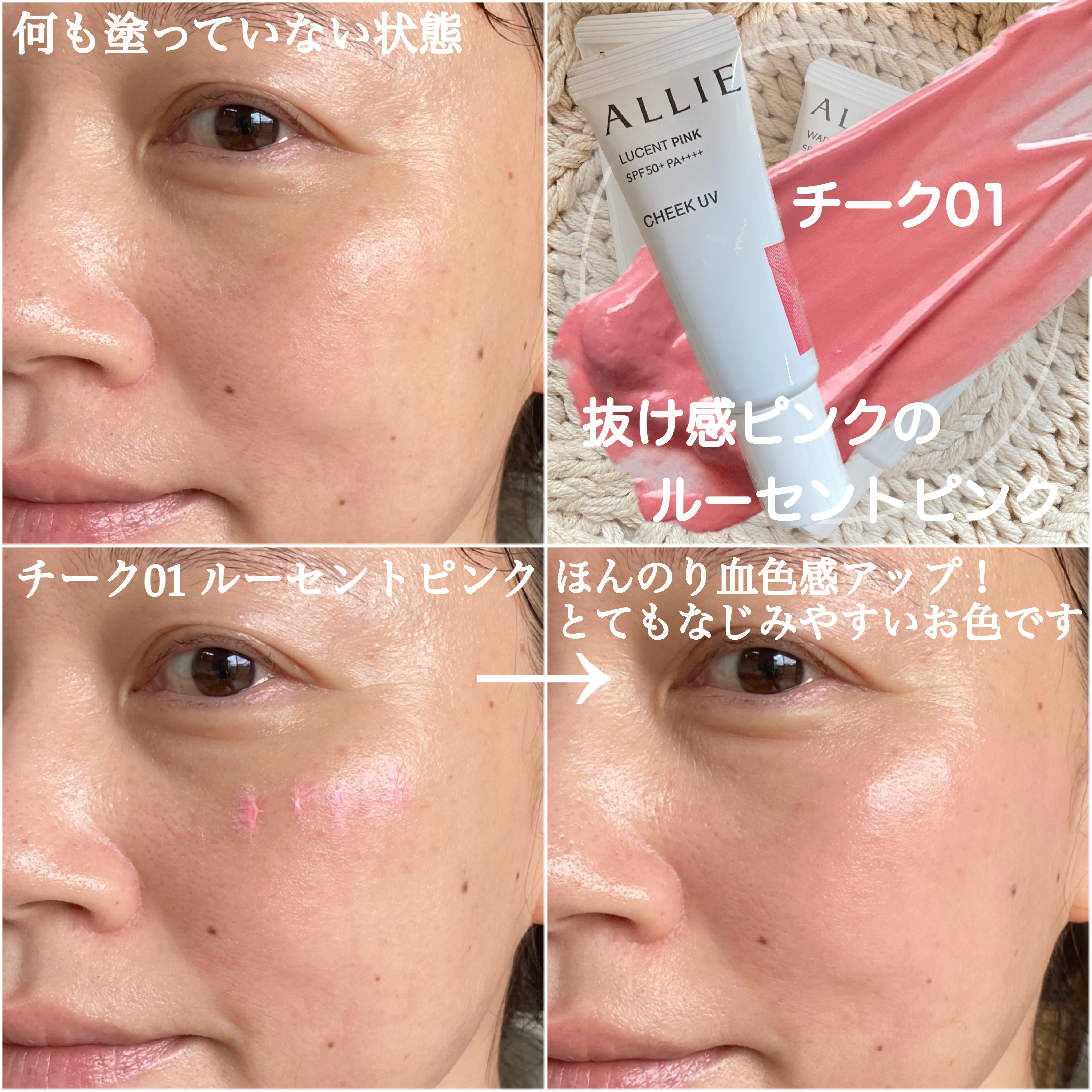 - ◆紫外線を浴びやすい、頬に使えるチークUV/鼻・頬に使える追いツヤUV ◆メイクの上から塗り直しとしても使える。 ◆汗・皮脂 マスクやタオルなどのこすれにも強く落ちにくい。 ◆「カラーUVヴェール技術」で、ベースメイクと混ざりにくく均一に密着。 SPF50+と感触の良さはそのままに素肌を活かした自然な色づきを両立! ◆8時間色持ち データ取得済み ※アリィー調べ。効果には個人差があります。 <基本情報> ・強力UV カット(SPF50+・PA++++) ・フリクションプルーフ:タオルやマスク等のこすれにも強く、落ちにくい ・スーパーウォータープルーフ:汗・水に抜群※²に強い機能 ※² アリィー商品内において LUCENT PINK(チーク 01) 自然に色づき血色感仕上がりの‟透け感ピンク” パッケージもピンクで、ポーチの中も華やぐメイクアイテムです WARM ORANGE(チーク 02) ヘルシーな血色感仕上げの‟じんわりオレンジ” じんわ~りと血色感を与えてくれるから、素肌を活かした自然な仕上がりに TRANSLUCENT(ラスター) ツヤ感を演出する‟シマーカラー” 鼻や頬にハイライトとして使うことで長時間ツヤが持続します