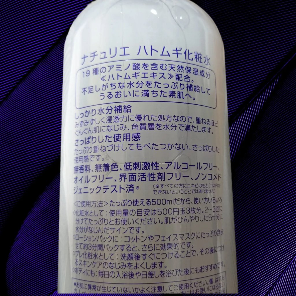 - <通常サイズ 500ml> 水、DPG、BG、グリセリン、ハトムギエキス、グリチルリチン酸2K、(スチレン/VP)コポリマー、クエン酸、クエン酸Na、メチルパラベン <500ml+ 限定ムーミンデザインボトル> 水、DPG、BG、グリセリン、ハトムギエキス、グリチルリチン酸2K、(スチレン/VP)コポリマー、クエン酸、クエン酸Na、メチルパラベン <詰め替えタイプ 480ml> 水、DPG、BG、グリセリン、ハトムギエキス、グリチルリチン酸2K、(スチレン/VP)コポリマー、クエン酸、クエン酸Na、メチルパラベン <旧製品> BG、グリセリン、メチルパラベン、エタノール、グリチルリチン酸2K、ハトムギエキス、DPG、クエン酸Na、プロピルパラベン、クエン酸、(スチレン/アクリレーツ)コポリマー、水 <限定ムーミンデザイン> 水、DPG、BG、グリセリン、ハトムギエキス、グリチルリチン酸2K、(スチレン/VP)コポリマー、クエン酸、クエン酸Na、メチルパラベン