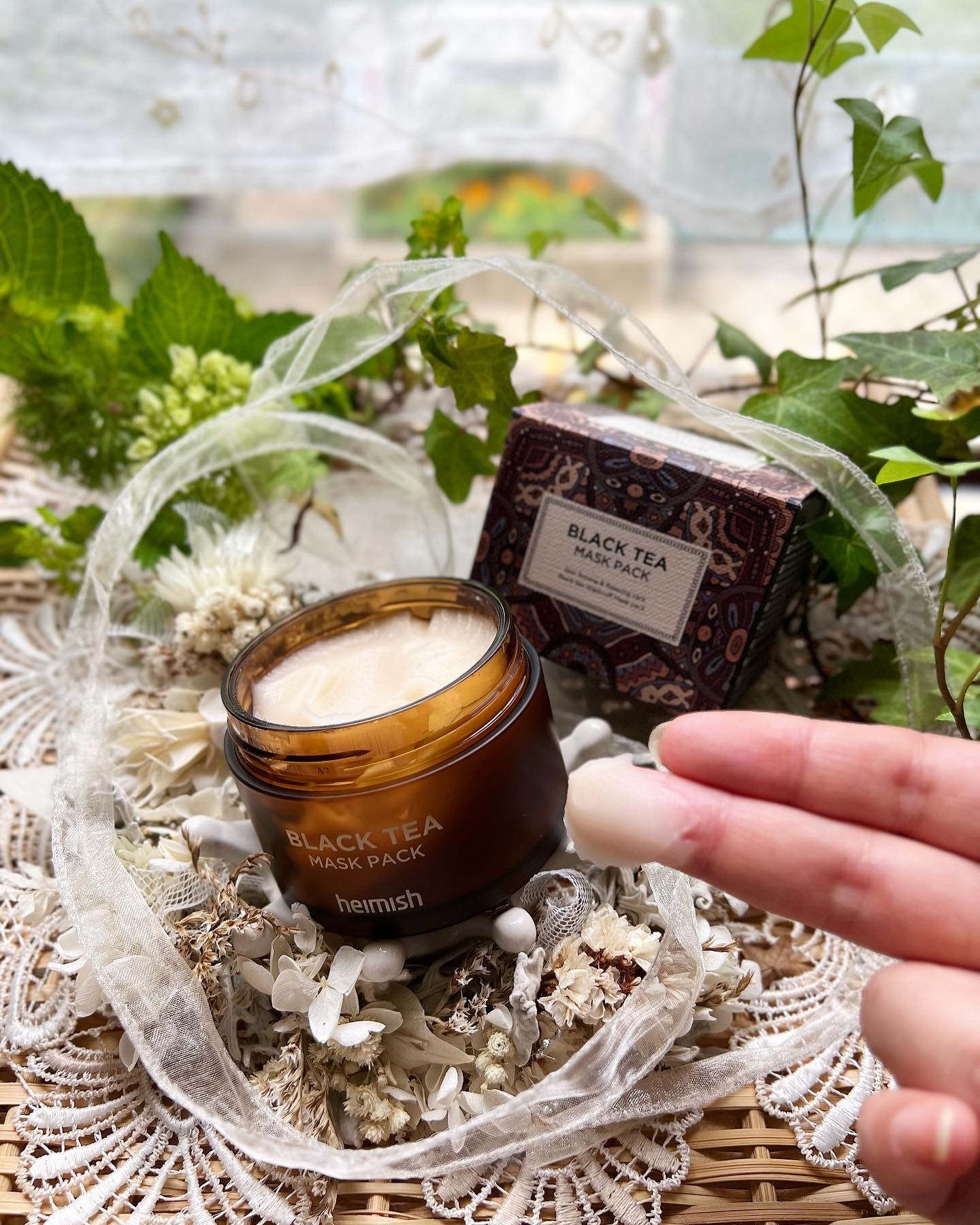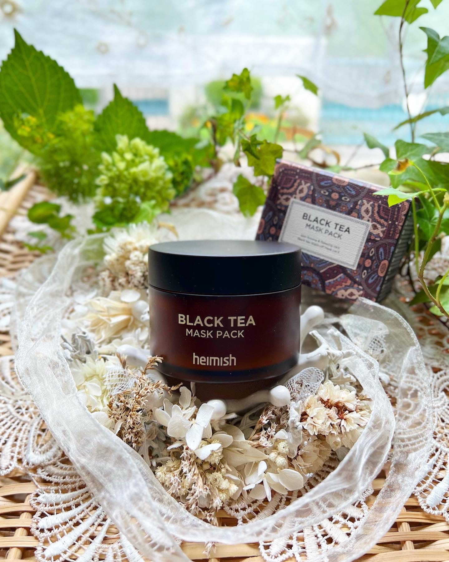 <heimishブラックティーマスクパック>を愛用中♪こちらは朝の+5分ケアに✨クーリング&スージングを叶えてくれる朝のむくみパックです😊お肌が飲む!?ブラックティーによる5分ケアマスク。お茶の葉を発酵させて作るブラックティーはポリフェノール...