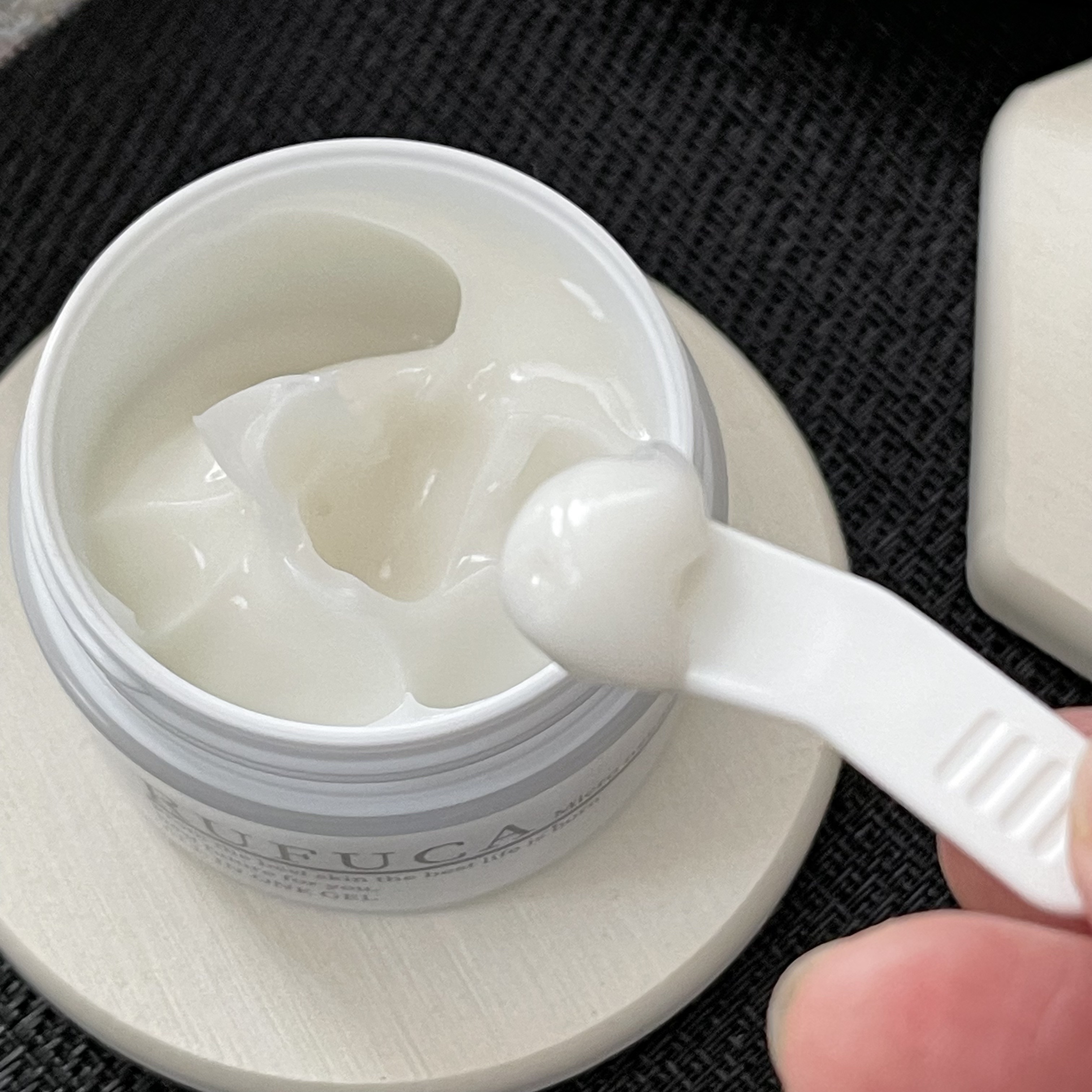 セサミオイル配合の高保湿✨ オイルイン・ジェルクリームクリーム うるおす、閉じ込める、守るで セサミオイルは肌の角層に浸透しやすいといわれており、高い保湿効果が期待できます。 ごま特有の希少成分「ゴマリグナン」をはじめ、美容成分を豊富に含むのも特徴。 とろんぷるんとしたジェルクリーム。 オイルを贅沢に配合しているそうですが みずみずしく伸びやかに使え フィット感のある使い心地です。