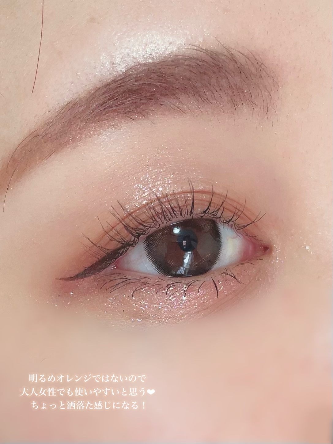 このアイシャドウは発色は薄めだけど その代わりにラメが凄くて!! なのでオレンジメイクしたいけど なかなか挑戦出来ない方とかにも◎ オレンジを単体で塗れば可愛い印象に ブラウンを加えれば大人っぽい印象に とっても可愛いアイシャドウなので 是非チェックしてみてください🍯💗