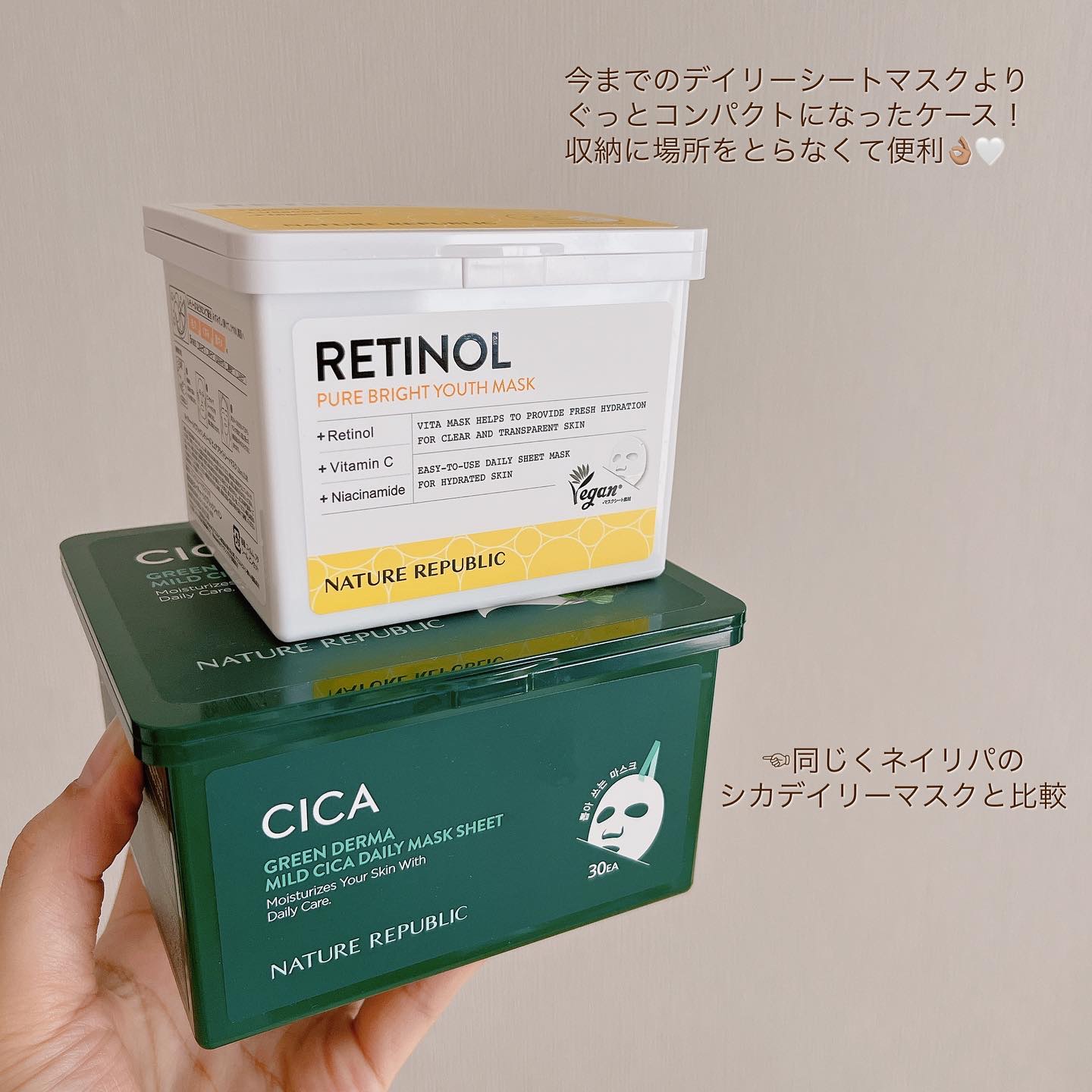 ネイチャーリパブリックのキューブマスク🟨・レチノールピュアブライトユースシートマスクヴィーガンのシートマスクにウォータータイプの美容液がヒタヒタに染み込んでいて、角質層のすみずみまでぐんぐん浸透💛くすんだお肌もワントーンアップしました✨レチノ...