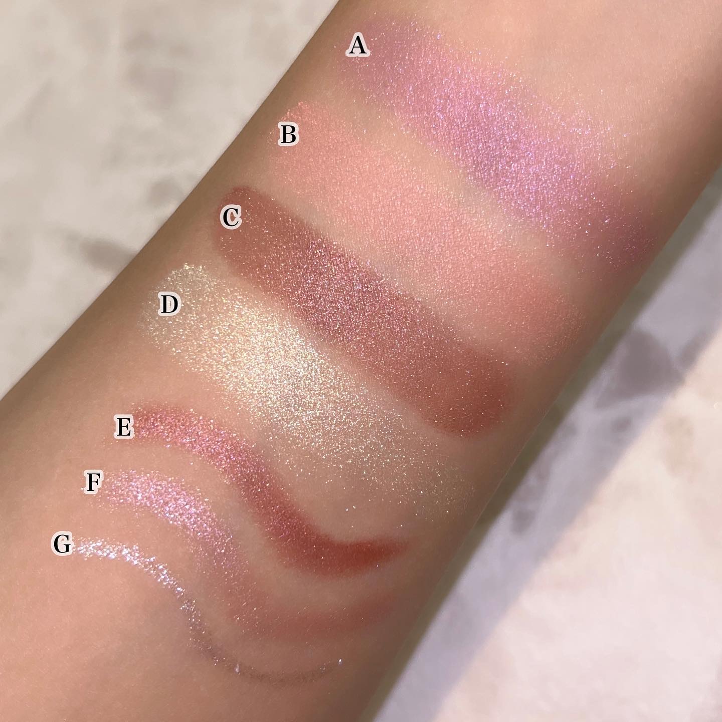 今回の新色は"まぶたに濡れたような光沢を放つ艶、光を操る立体感をプラスしリュクスなまなざしを叶えてくれる"というプリズムフォーミュラ。 確かにいつもとはちょっと違う…良いですこれ🫶❤️ ヌメッと面で光るようなツヤ感✨ テクスチャーは刻印ありタイプ、ツヤはクリームタイプに近いと思います🥰 要は刻印ありとクリームの良いとこ取りですね! ゴールドと柔らかいレッドの組み合わせ。アプレスキーとエレクトリックチェリーの中間のような色合い🤔 ゴールドとピーチカラー。今回の3色の中では一番黄みが強い。 青みがかったローズが可愛い。ぱっと見はわからないけど左上にみんな大好き青ラメが…!!