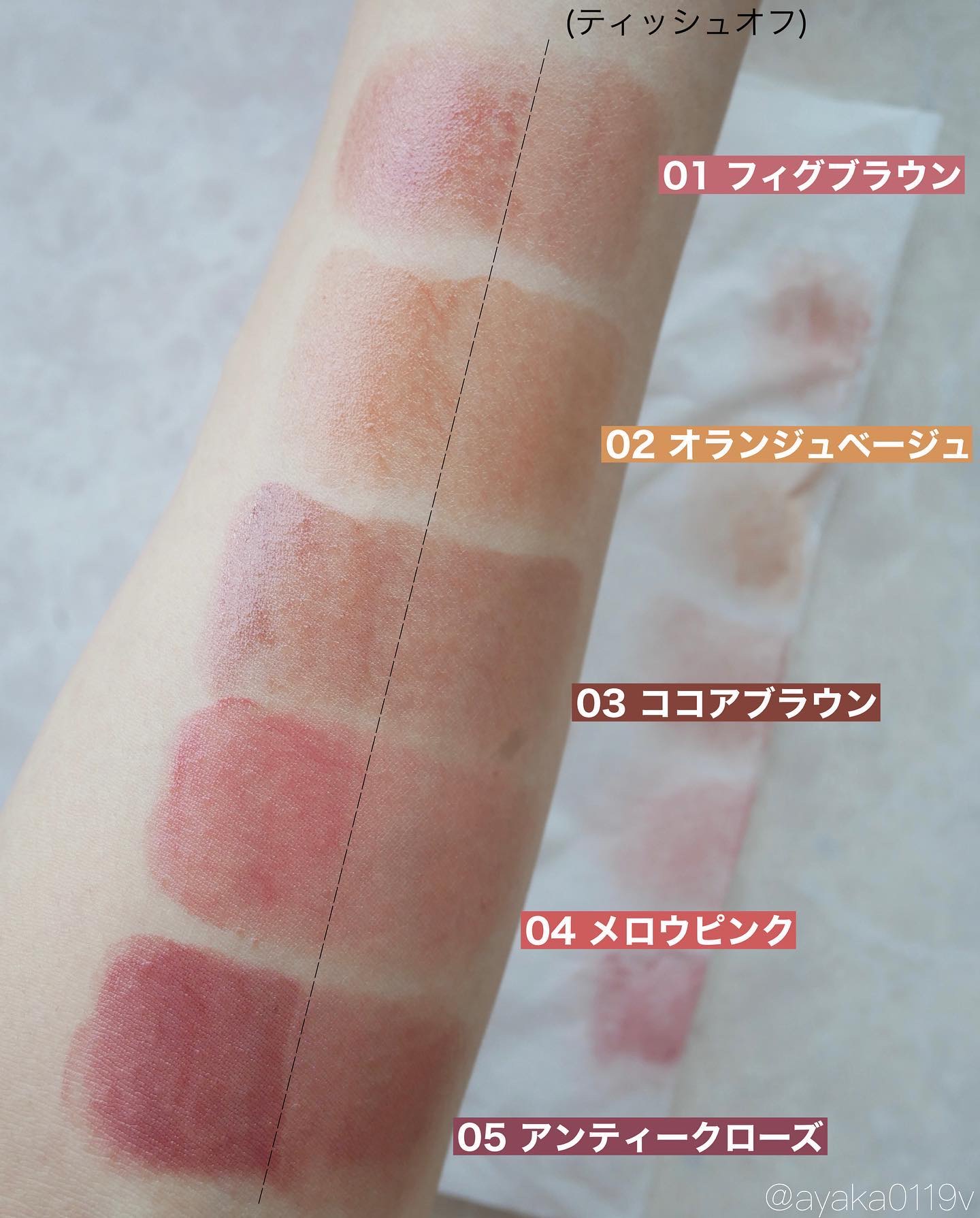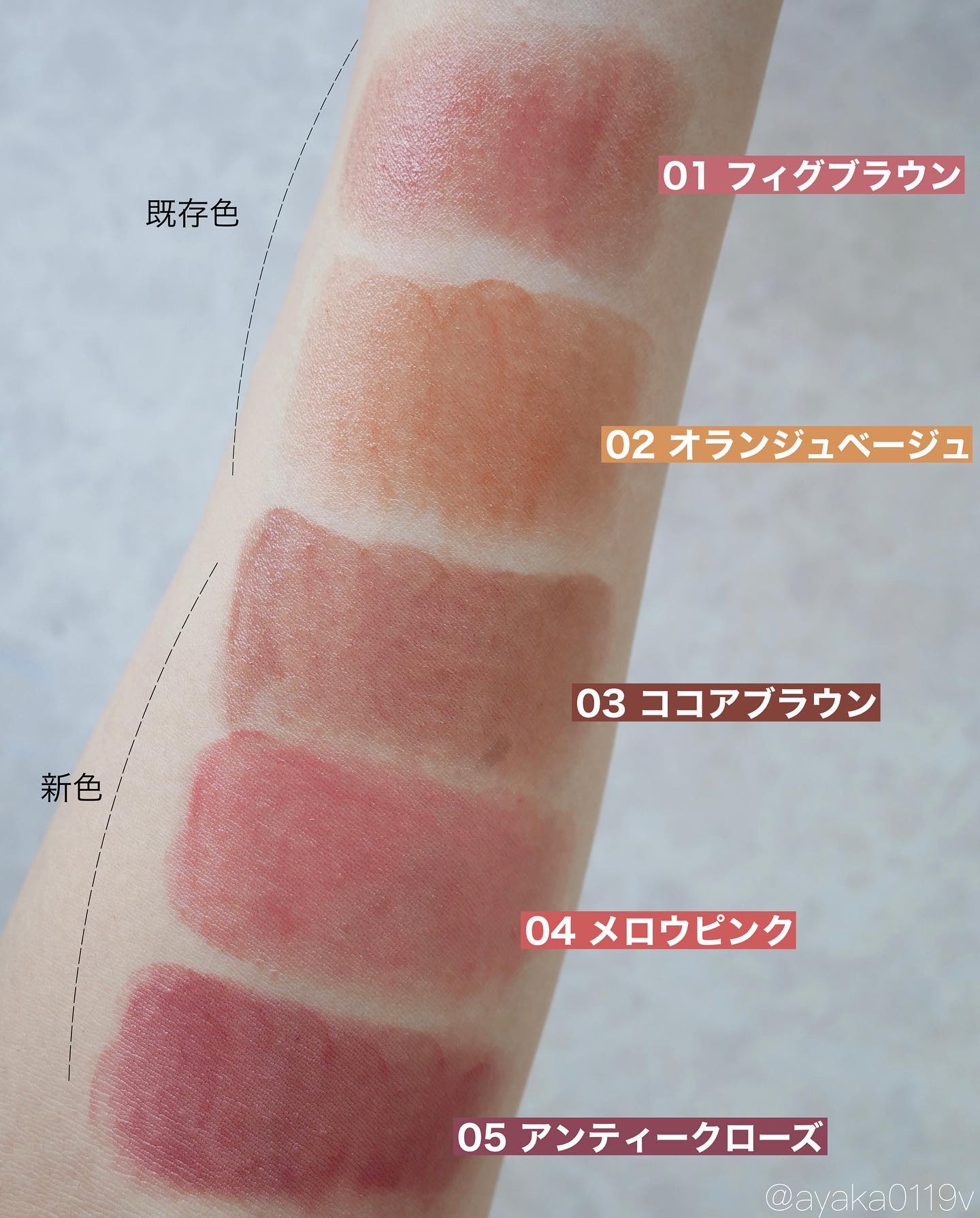 - <01 フィグブラウン> ジフェニルジメチコン、トリエチルヘキサノイン、トリ(カプリル酸/カプリン酸)グリセリル、PEGー12ジメチコン、ジフェニルシロキシフェニルトリメチコン、リンゴ酸ジイソステアリル、ポリエチレン、ペンタイソステアリン酸ジペンタエリスリチル、トリイソステアリン酸ポリグリセリルー2、ラウロイルグルタミン酸ジ(フィトステリル/オクチルドデシル)、合成ワックス、マイクロクリスタリンワックス、トコフェロール、アルガニアスピノサ核油、シア脂油、ホホバ種子油、ウラボシヤハズエキス、酸化チタン、酸化鉄、黄4、赤201、赤202、硫酸Ba、水酸化Al <02 オランジュベージュ> ジフェニルジメチコン、トリエチルヘキサノイン、トリ(カプリル酸/カプリン酸)グリセリル、PEGー12ジメチコン、ジフェニルシロキシフェニルトリメチコン、リンゴ酸ジイソステアリル、ポリエチレン、ペンタイソステアリン酸ジペンタエリスリチル、トリイソステアリン酸ポリグリセリルー2、ラウロイルグルタミン酸ジ(フィトステリル/オクチルドデシル)、合成ワックス、マイクロクリスタリンワックス、トコフェロール、アルガニアスピノサ核油、シア脂油、ホホバ種子油、ウラボシヤハズエキス、黄4、酸化鉄、酸化チタン、赤201、赤202、硫酸Ba、水酸化Al <03 ココアブラウン> ジフェニルジメチコン、トリエチルヘキサノイン、トリ(カプリル酸/カプリン酸)グリセリル、PEGー12ジメチコン、ジフェニルシロキシフェニルトリメチコン、リンゴ酸ジイソステアリル、ポリエチレン、ペンタイソステアリン酸ジペンタエリスリチル、トリイソステアリン酸ポリグリセリルー2、ラウロイルグルタミン酸ジ(フィトステリル/オクチルドデシル)、合成ワックス、マイクロクリスタリンワックス、トコフェロール、アルガニアスピノサ核油、シア脂油、ホホバ種子油、ウラボシヤハズエキス、酸化鉄、酸化チタン、黄4、赤201、赤202、硫酸Ba、水酸化Al <04 メロウピンク> ジフェニルジメチコン、トリエチルヘキサノイン、トリ(カプリル酸/カプリン酸)グリセリル、PEGー12ジメチコン、ジフェニルシロキシフェニルトリメチコン、リンゴ酸ジイソステアリル、ポリエチレン、ペンタイソステアリン酸ジペンタエリスリチル、トリイソステアリン酸ポリグリセリルー2、ラウロイルグルタミン酸ジ(フィトステリル/オクチルドデシル)、合成ワックス、マイクロクリスタリンワックス、トコフェロール、アルガニアスピノサ核油、シア脂油、ホホバ種子油、ウラボシヤハズエキス、酸化チタン、酸化鉄、黄4、赤201、赤202、硫酸Ba、水酸化Al <05 アンティークローズ> ジフェニルジメチコン、トリエチルヘキサノイン、トリ(カプリル酸/カプリン酸)グリセリル、PEGー12ジメチコン、ジフェニルシロキシフェニルトリメチコン、リンゴ酸ジイソステアリル、ポリエチレン、ペンタイソステアリン酸ジペンタエリスリチル、トリイソステアリン酸ポリグリセリルー2、ラウロイルグルタミン酸ジ(フィトステリル/オクチルドデシル)、合成ワックス、マイクロクリスタリンワックス、トコフェロール、アルガニアスピノサ核油、シア脂油、ホホバ種子油、ウラボシヤハズエキス、酸化鉄、酸化チタン、黄4、赤201、赤202、硫酸Ba、水酸化Al <06 ロゼベージュ> ジフェニルジメチコン、トリエチルヘキサノイン、トリ(カプリル酸/カプリン酸)グリセリル、PEG―12ジメチコン、ジフェニルシロキシフェニルトリメチコン、リンゴ酸ジイソステアリル、ポリエチレン、ペンタイソステアリン酸ジペンタエリスリチル、トリイソステアリン酸ポリグリセリル-2、ラウロイルグルタミン酸ジ(フィトステリル/オクチルドデシル)、合成ワックス、マイクロクリスタリンワックス、トコフェロール、アルガニアスピノサ核油、シア脂油、ホホバ種子油、ウラボシヤハズエキス、酸化チタン、酸化鉄、黄4、赤201、赤202、硫酸Ba、水酸化Al <07 スイートローズ> ジフェニルジメチコン、トリエチルヘキサノイン、トリ(カプリル酸/カプリン酸)グリセリル、PEG―12ジメチコン、ジフェニルシロキシフェニルトリメチコン、リンゴ酸ジイソステアリル、ポリエチレン、ペンタイソステアリン酸ジペンタエリスリチル、トリイソステアリン酸ポリグリセリル-2、ラウロイルグルタミン酸ジ(フィトステリル/オクチルドデシル)、合成ワックス、マイクロクリスタリンワックス、トコフェロール、アルガニアスピノサ核油、シア脂油、ホホバ種子油、ウラボシヤハズエキス、酸化チタン、酸化鉄、黄4、赤201、赤202、硫酸Ba、水酸化Al <08 チェリーレッド> ジフェニルジメチコン、トリエチルヘキサノイン、トリ(カプリル酸/カプリン酸)グリセリル、PEG-12ジメチコン、ジフェニルシロキシフェニルトリメチコン、リンゴ酸ジイソステアリル、ポリエチレン、ペンタイソステアリン酸ジペンタエリスリチル、トリイソステアリン酸ポリグリセリル-2、ラウロイルグルタミン酸ジ(フィトステリル/オクチルドデシル)、合成ワ