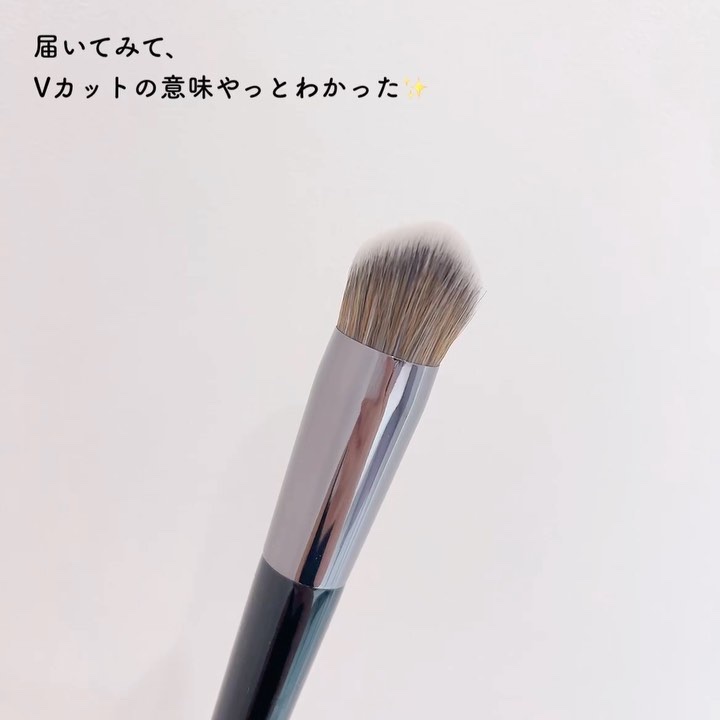 - ファンデーション&シェーディングブラシ 顔の輪郭に合わせやすいVカッティングで、目の下、小鼻、フェイスラインなど、 ラインにあわせて繊細にカバーできます。 メイク初心者でも簡単にプロの仕上がりに近づけられます。 ブラシの跡も付きにくいびっしり詰まった毛が、やわらかくしっかりと肌に密着。 ファンデーションを適量含ませて、Vカッティング面を顔に密着させながら塗り伸ばします。カバーが必要な鼻、目元はブラシを立てて塗ります。