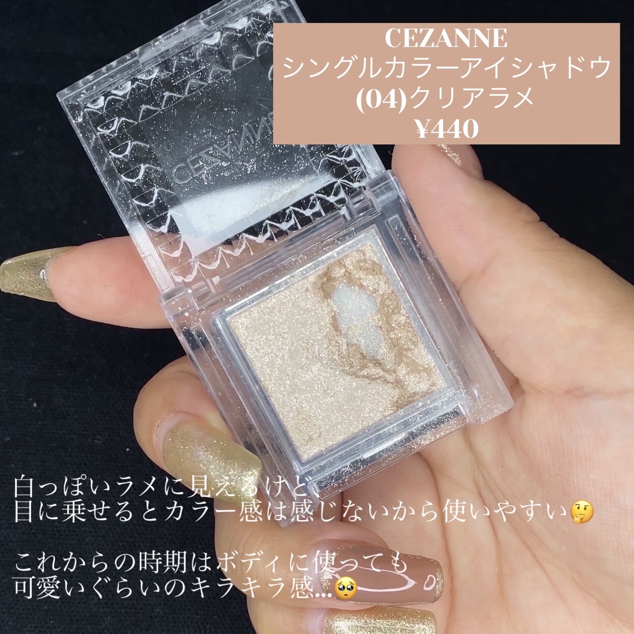 これ1つでナチュラルにも派手メイクにも◎ これ本当にキラキラで 発色てきにはそこまで強くないからナチュラルメイクにもいける◎ 時間ない時にこれ1つぐわっとアイホールにのせれば、派手メイクがすぐ出来る👏👏👏