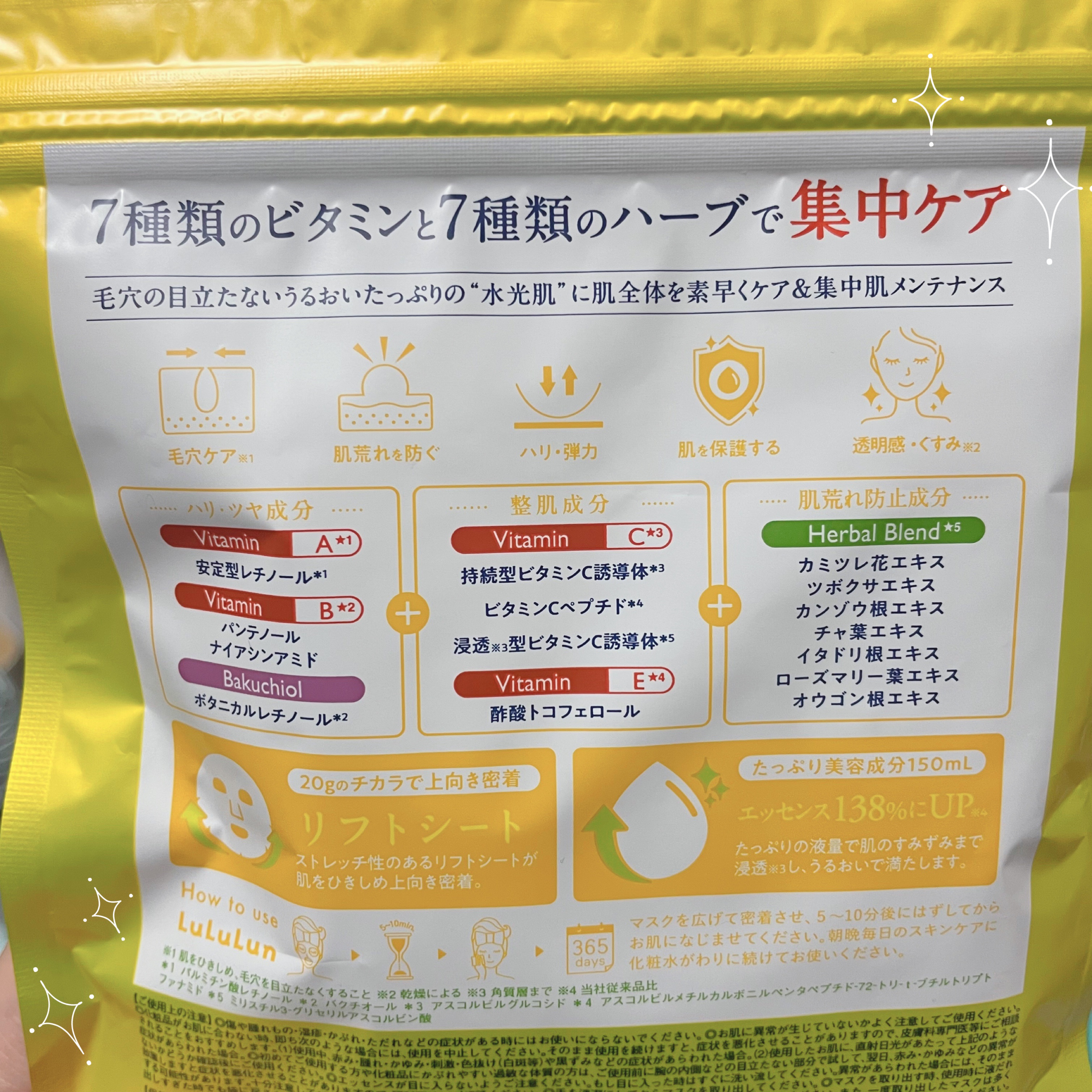 - ルルルンからビタミンたっぷりの化粧水フェイスマスクが新登場。 7種類のビタミン※1と7種類のハーブ※1で肌全体を素早くケア&集中肌メンテナンス。 新開発のフェイスラインに密着するシートで肌を引き締めながら肌のすみずみ※2までうるおいで満たし、毛穴の目立たないうるおいたっぷりの“水光肌”へ。 (※1 全て保湿成分として ※2 角質層まで)