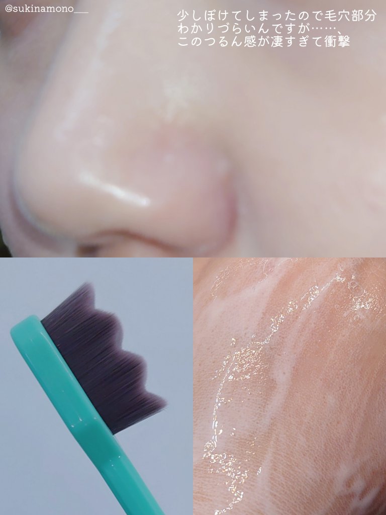 栗の渋皮に含まれる“タンニン”に着目! 保湿・皮脂コントロール*1をして、サラサラ肌に導いてくれるんだって はぶらしみたいなこのブラシは超極毛だから、毛穴までアプローチしてくれる 触り心地がすごく柔らかくて気持ち良いよ 緩めのジェルは肌にのせると、とろーっと垂れるくらいのテクスチャー 爽やかなフローラル風な香りで私はとってもお気に入り お肌にジェルを伸ばしたら、気になる部分はブラシでくるくるーとマッサージします すっきりした使い心地 小鼻の毛穴汚れが目立たなくなると良いな