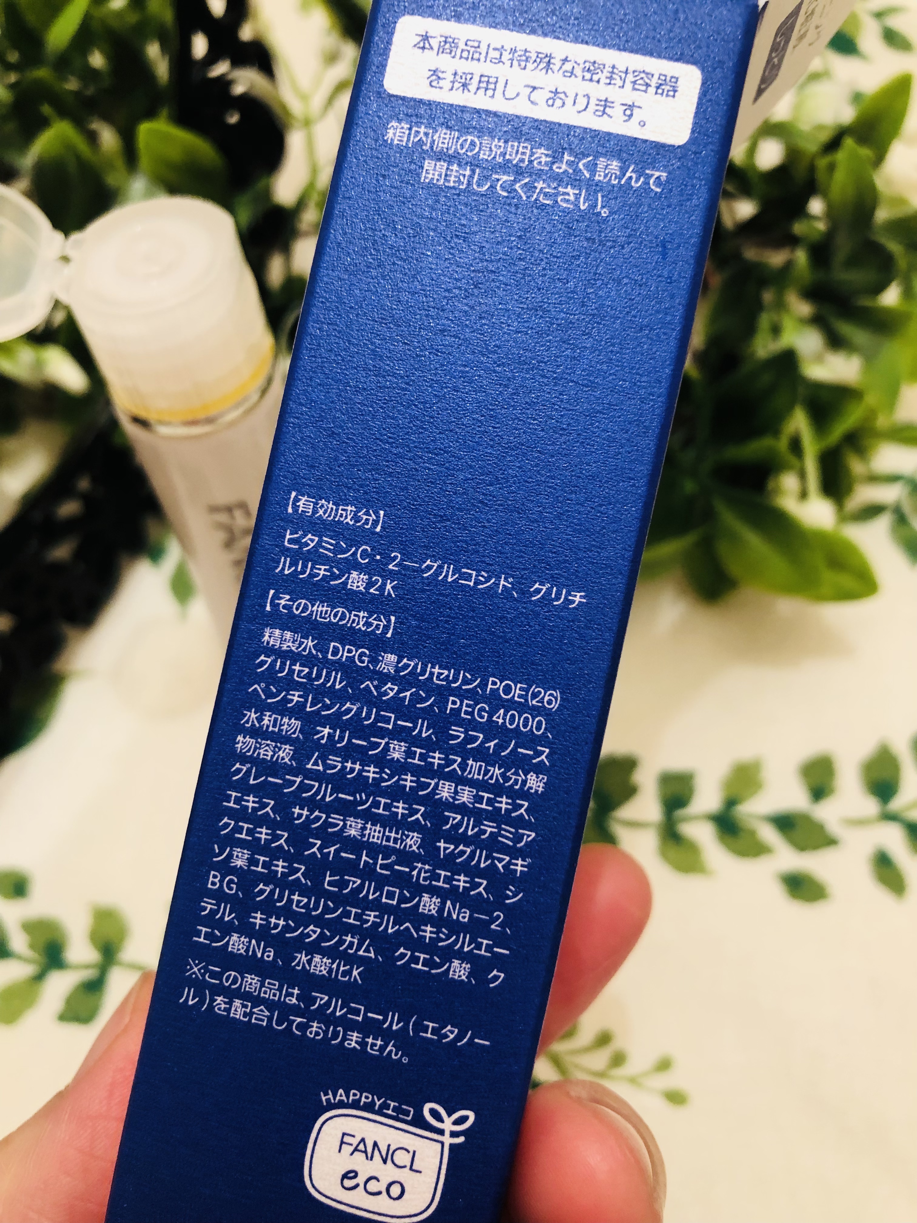 - <30ml> ビタミンC・2-グルコシド、グリチルレチン酸ステアリル、精製水、濃グリセリン、イソステアリン酸イソステアリル、植物性スクワラン、DPG、α-オレフィンオリゴマー、BG、トレハロース、テトラエチルヘキサン酸ペンタエリスリチル、ベタイン、ペンチレングリコール、ステアリン酸ポリグリセリル、ベヘニルアルコール、オリーブ葉エキス加水分解物溶液、ムラサキシキブ果実エキス、グレープフルーツエキス、アルテミアエキス、サクラ葉抽出液、ヤグルマギクエキス、スイートピー花エキス、シソ葉エキス、ヒアルロン酸Na-2、アルカリゲネス産生多糖体、天然ビタミンE、d-δ-トコフェロール、ラウロイルグルタミン酸ジ(フィトステリル・オクチルドデシル)、水酸化K、ジメチコン、ラフィノース水和物、トリステアリン酸デカグリセリル、カルボキシビニルポリマー、ジグリセリン、クエン酸Na、グリセリンエチルヘキシルエーテル、キサンタンガム、クエン酸