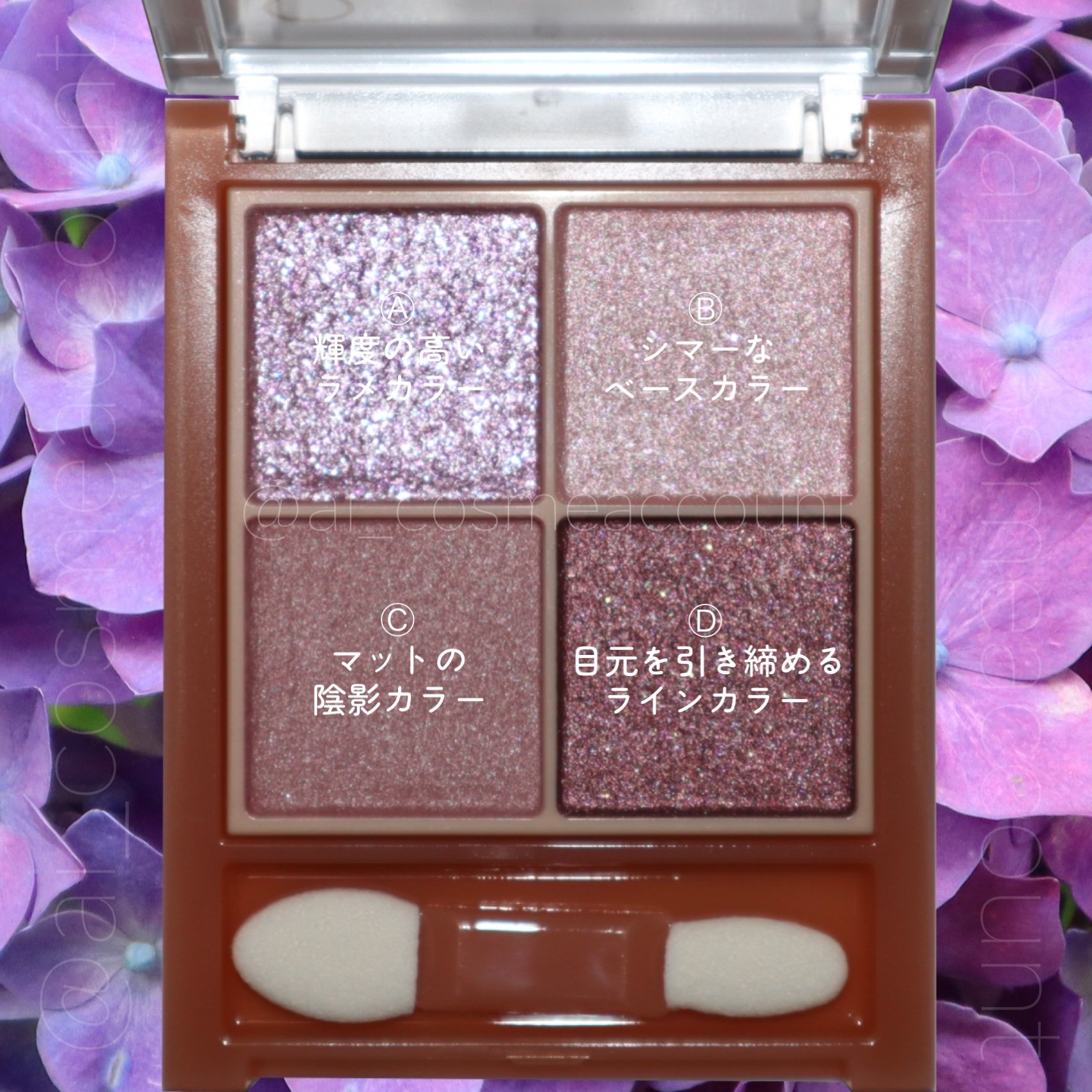 - ラメ・パール・マット3質感の4色アイシャドウ。 肌馴染みの良いベージュを基調としたカラー。ラメ・パール・マットの3質感を重ねて、自然にまぶたを強調し奥行のある大きな目元へ。 しっとり溶け込むような柔らかなパウダーなので、スルスル伸びてまぶたにピタッと密着。保湿成分(スクワラン・ホホバ種子油)配合。